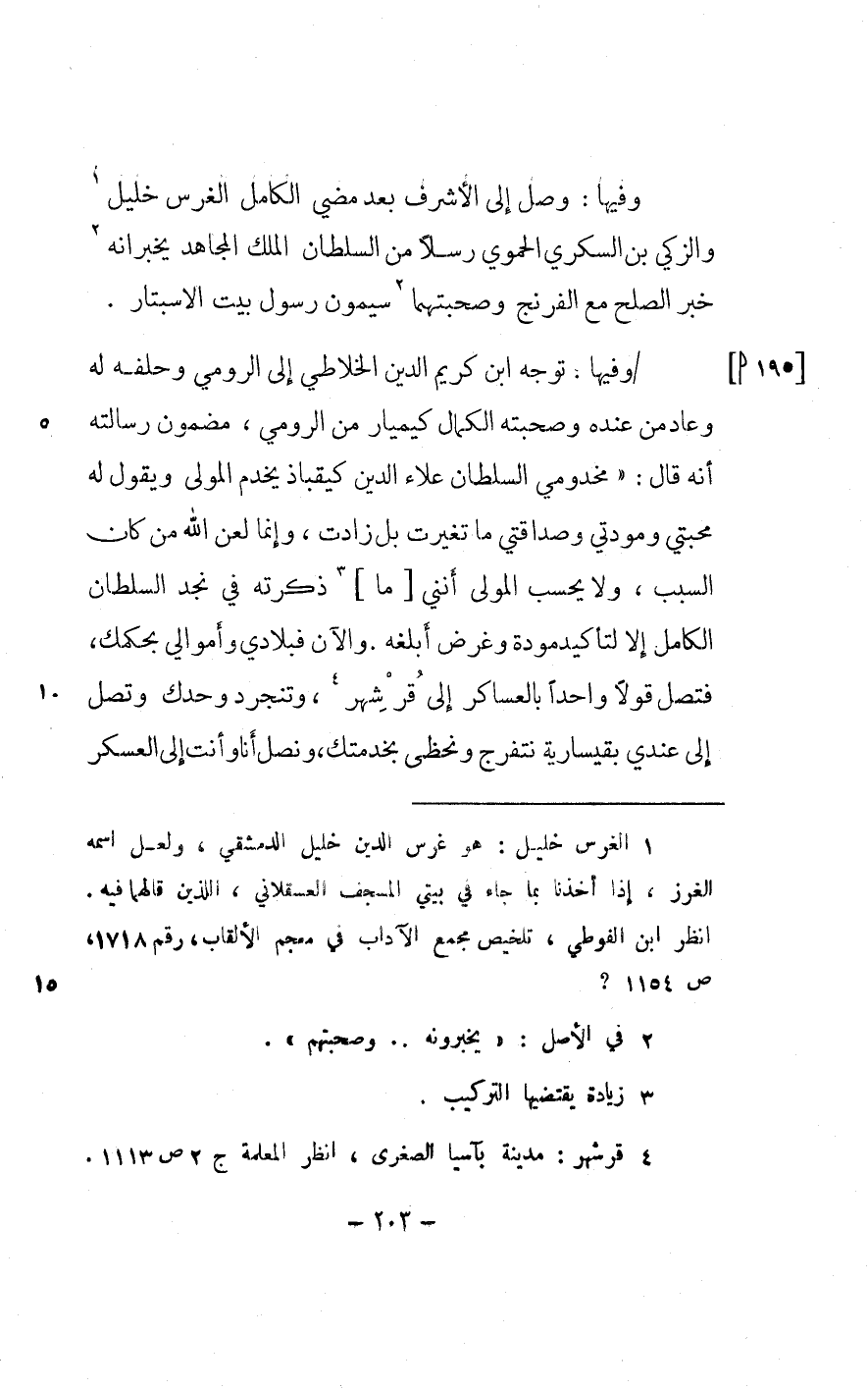 وفيهَا توجه ابْن كريم الدّين الخلاطي إِلَى الرُّومِي وحلفه لَهُ وَعَاد من عِنْده وصحبته الْكَمَال كيميار من الرُّومِي مَضْمُون رسَالَته أَنه قَالَ مخدومي السُّلْطَان عَلَاء الدّين كيقباذ يخْدم الْمولى وَيَقُول لَهُ محبتي ومودتي وصداقتي مَا تَغَيَّرت بل زَادَت وَإِنَّمَا لعن الله من كَانَ السَّبَب وَلَا يحْسب الْمولى أنني مَا ذكرته فِي نجد السُّلْطَان الْكَامِل إِلَّا لتأكيد مَوَدَّة وغرض أبلغه