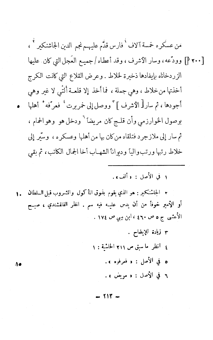 من عسكره خَمْسَة آلَاف فَارس قدم عَلَيْهِم نجم الدّين الجاشنكير وودعه وَسَار الْأَشْرَف وَقد أعطَاهُ جَمِيع الْعجل الَّتِي كَانَ عَلَيْهَا الزردخاناه بإيفادها ذخيرة لخلاط