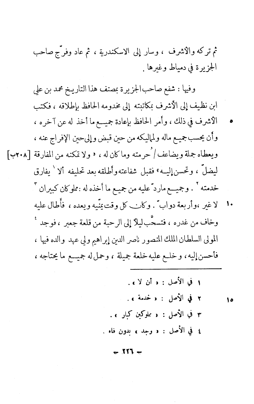 وفيهَا شفع صَاحب الجزيرة بمصنف هَذَا التَّارِيخ مُحَمَّد بن عَليّ ابْن نظيف إِلَى الْأَشْرَف بمكاتبته إِلَى مخدومه الْحَافِظ بِإِطْلَاقِهِ فَكتب الْأَشْرَف فِي ذَلِك وَأمر الْحَافِظ بِإِعَادَة جَمِيع مَا أَخذ لَهُ عَن آخِره وَأَن يحْسب جَمِيع مَاله ولمماليكه من حِين قبض وَإِلَى حِين الإفراج عَنهُ ويعطاه جملَة ويضاعف حرمته وَمَا كَانَ لَهُ وَلَا تمكنه من الْمُفَارقَة ليضل وتحسن إِلَيْهِ فَقبل شَفَاعَته وَأطْلقهُ بعد تَحْلِيفه أَلا يُفَارق خدمته