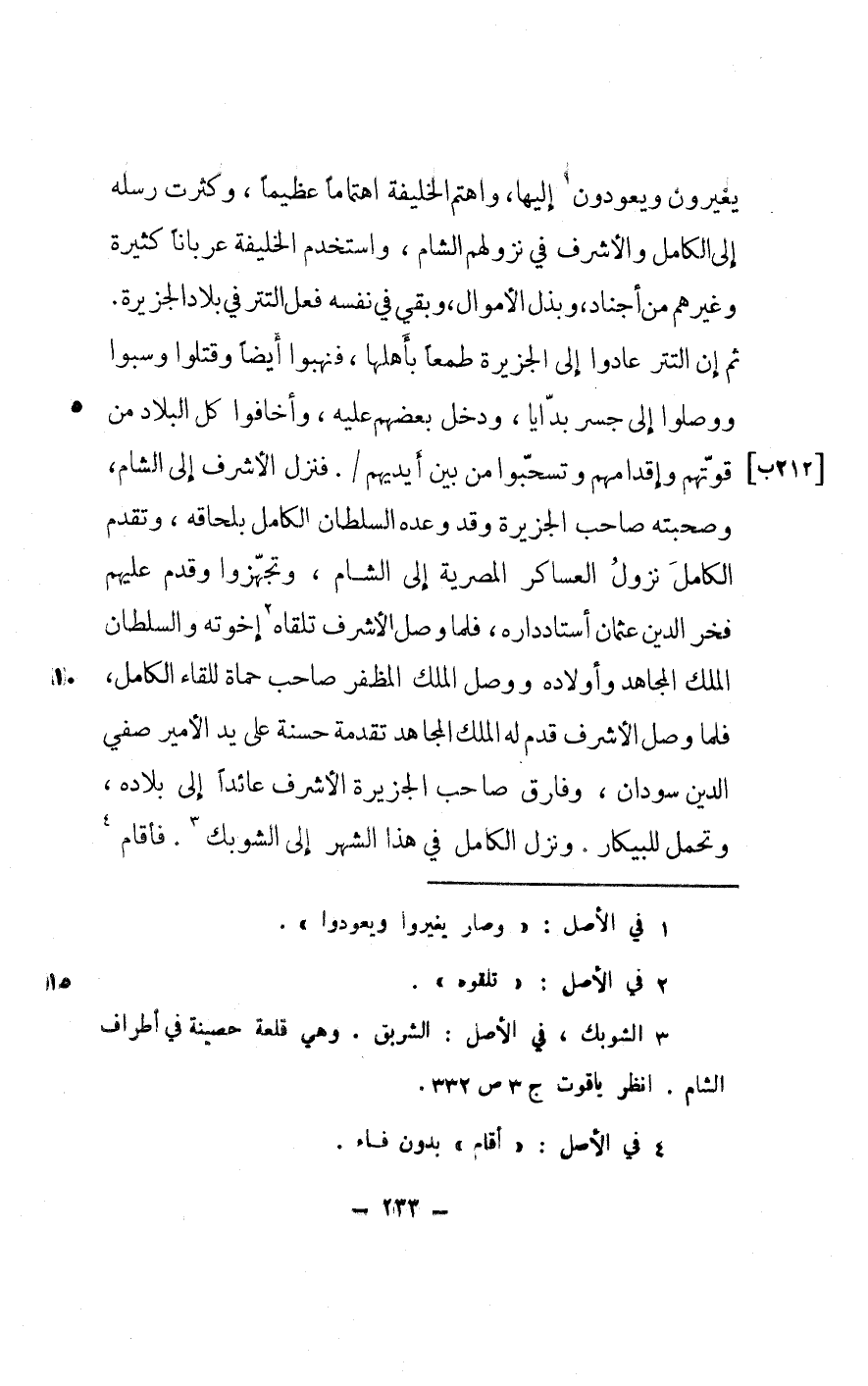 يغيرون ويعودون إِلَيْهَا واهتم الْخَلِيفَة اهتماما عَظِيما وَكَثُرت رسله إِلَى الْكَامِل والأشرف فِي نزولهم الشَّام واستخدم الْخَلِيفَة عربانا كَثِيرَة وَغَيرهم من أجناد وبذل الْأَمْوَال وَبَقِي فِي نَفسه فعل التتر فِي بِلَاد الجزيرة