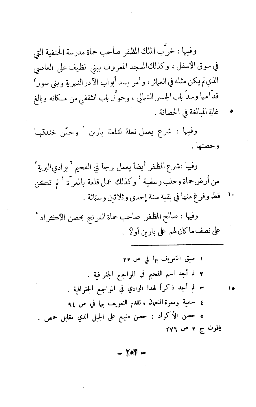 وفيهَا خرب الْملك المظفر صَاحب حماة مدرسة الْحَنَفِيَّة الَّتِي فِي سوق الْأَسْفَل وَكَذَلِكَ الْمَسْجِد الْمَعْرُوف ببني نظيف على العَاصِي الَّذِي لم يكن مثله فِي العمائر وَأمر بسد أَبْوَاب الآدر النهرية وَبنى سورا قدامها وسد بَاب الجسر الشمالي وحول بَاب الثَّقَفِيّ من مَكَانَهُ وَبَالغ غَايَة الْمُبَالغَة فِي الحصانة
