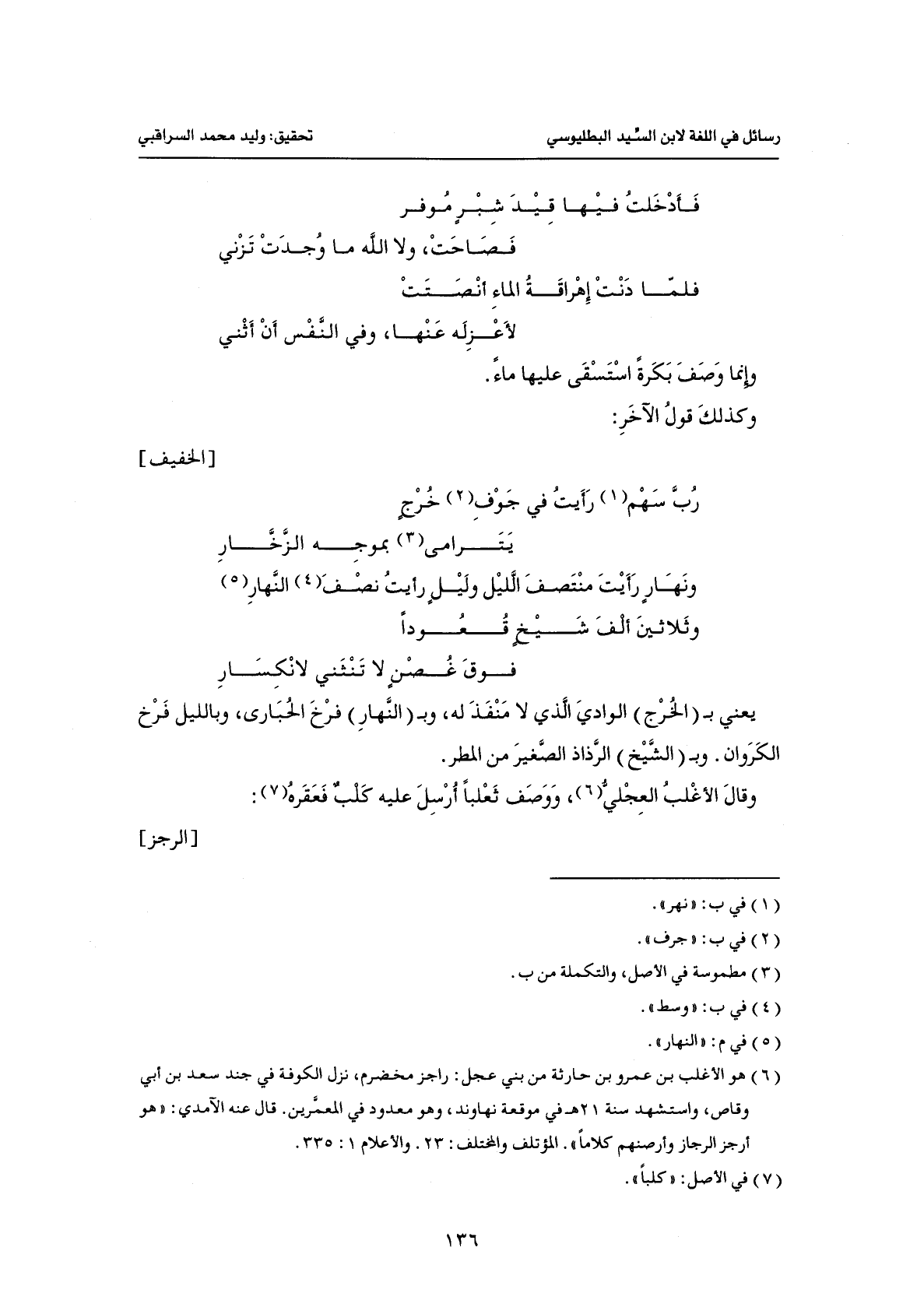 يعني بـ (الخرج) الوادي الذي لا منفذ له، وبـ (النهار) فرخ الحبارى، وبالليل فرخ الكروان. وبـ (الشيخ) الرذاذ الصغير من المطر.