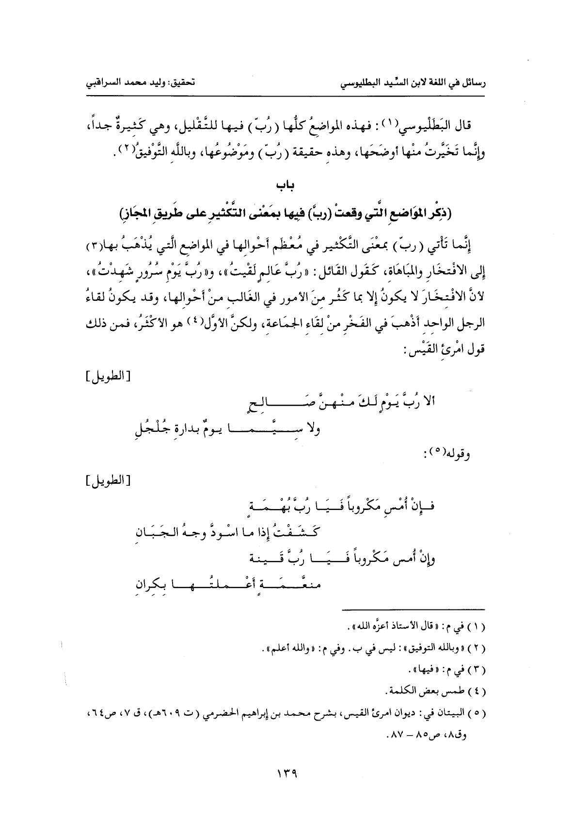 قال البطليوسي: فهذه المواضع كلها (رب) فيها للتقليل، وهي كثيرةٌ جداً، وإنما تخيرت منها أوضحها، وهذه حقيقة (رب) وموضوعها، وبالله التوفيق.