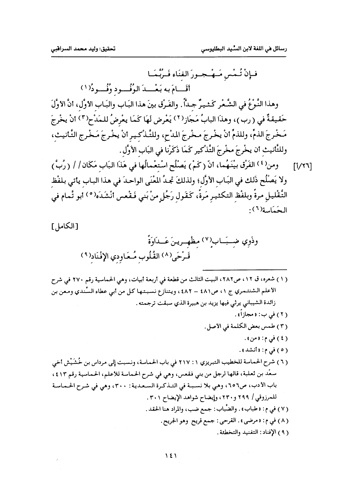 وهذا النوع في الشعر كثير جداً. والفرق بين هذا الباب والباب الأول، أن الأول حقيقة في (رب)، وهذا الباب مجاز يعرض لها كما يعرض للمدح أن يخرج مخرج الذم، وللذم أن يخرج مخرج المدح، وللتذكير أن يخرج مخرج التأنيث، وللتأنيث أن يخرج مخرج التذكير كما ذكرنا في الباب الأول. ومن الفرق بينهما، أن (كم) يصلح استعمالها في هذا الباب مكان// (رب) ولا يصلح ذلك في الباب الأول؛ ولذلك تجد المعنى الواحد في هذا الباب يأتي بلفظ التقليل مرة وبلفظ التكثير مرة، كقول رجل من بني فقعس أنشده أبو تمام في الحماسة: