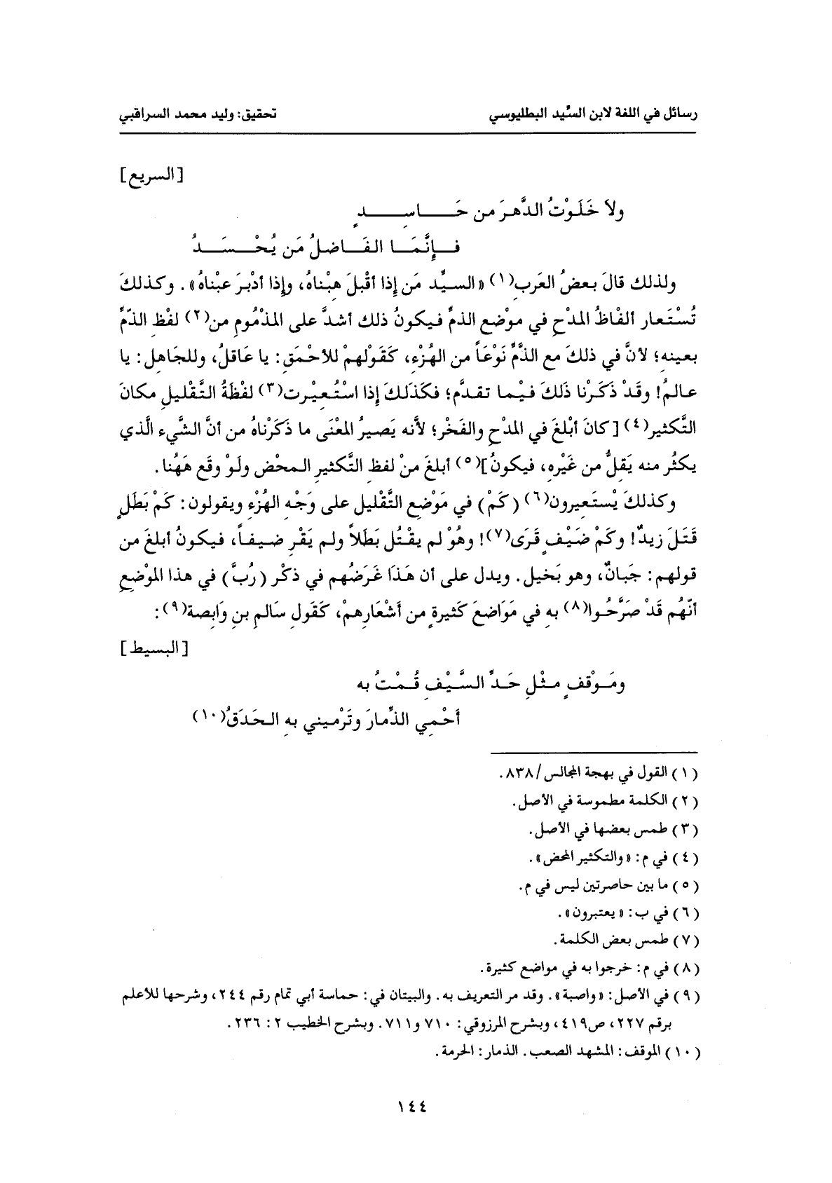 ولذلك قال بعض العرب «السيد من إذا أقبل هبناه، وإذا أدبر عبناه». وكذلك تستعار ألفاظ المدح في موضع الذم فيكون ذلك أشد على المذموم من لفظ الذم بعينه؛ لأن في ذلك مع الذم نوعاً من الهزء، كقولهم للأحمق: يا عاقل، وللجاهل: يا عالم! وقد ذكرنا ذلك فيما تقدم؛ فكذلك إذا استعيرت لفظة التقليل مكان التكثير [كان أبلغ في المدح والفخر؛ لأنه يصير المعنى ما ذكرناه من أن الشيء الذي يكثر منه يقل من غيره، فيكون] أبلغ من لفظ التكثير المحض ولو وقع ههنا. وكذلك يستعيرون (كم) في موضع التقليل على وجه الهزء ويقولون: كم بطل قتل زيد! وكم ضيف قرى! وهو لم يقتل بطلاً ولم يقر ضيفاً، فيكون أبلغ من قولهم: جبان، وهو بخيل. ويدل على أن هذا غرضهم في ذكر (رب) في هذا الموضع أنهم قد صرحوا به في مواضع كثيرة من أشعارهم، كقول سالم بن وابصة:
