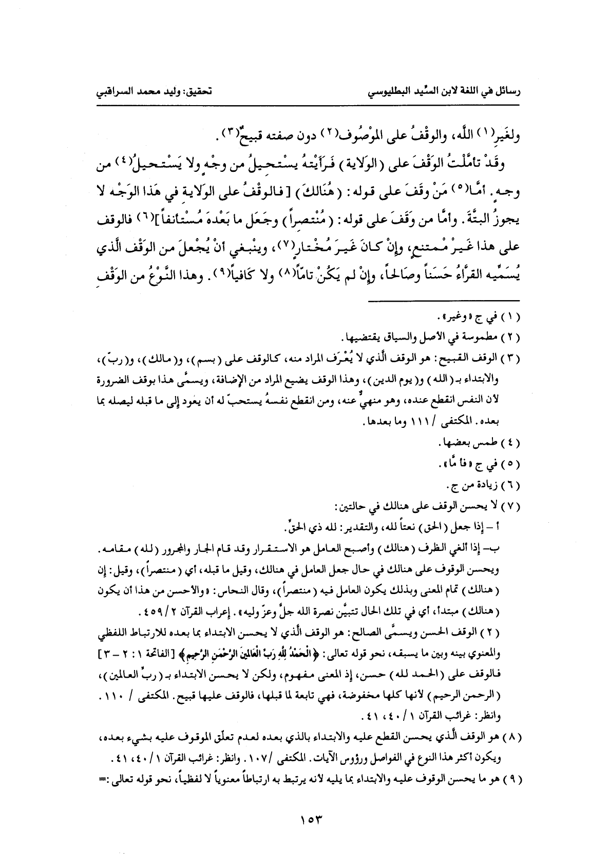 ولغير الله، والوقف على الموصوف دون صفته قبيح. وقد تأملت الوقف على (الولاية) فرأيته يستحيل من وجه لا يستحيل من وجه. أما من وقف على قوله: (هنالك) [فالوقف على الولاية في هذا الوجه لا يجوز البتة. وأما من وقف على قوله: (منتصراً) وجعل ما بعده مستأنفاً] فالوقف على هذا غير ممتنع، وإن كان غير مختار، وينبغي أن يجعل من الوقف الذي يسميه القراء حسناً وصالحاً، وإن لم يكن تاماً ولا كافياً. وهذا النوع من الوقف