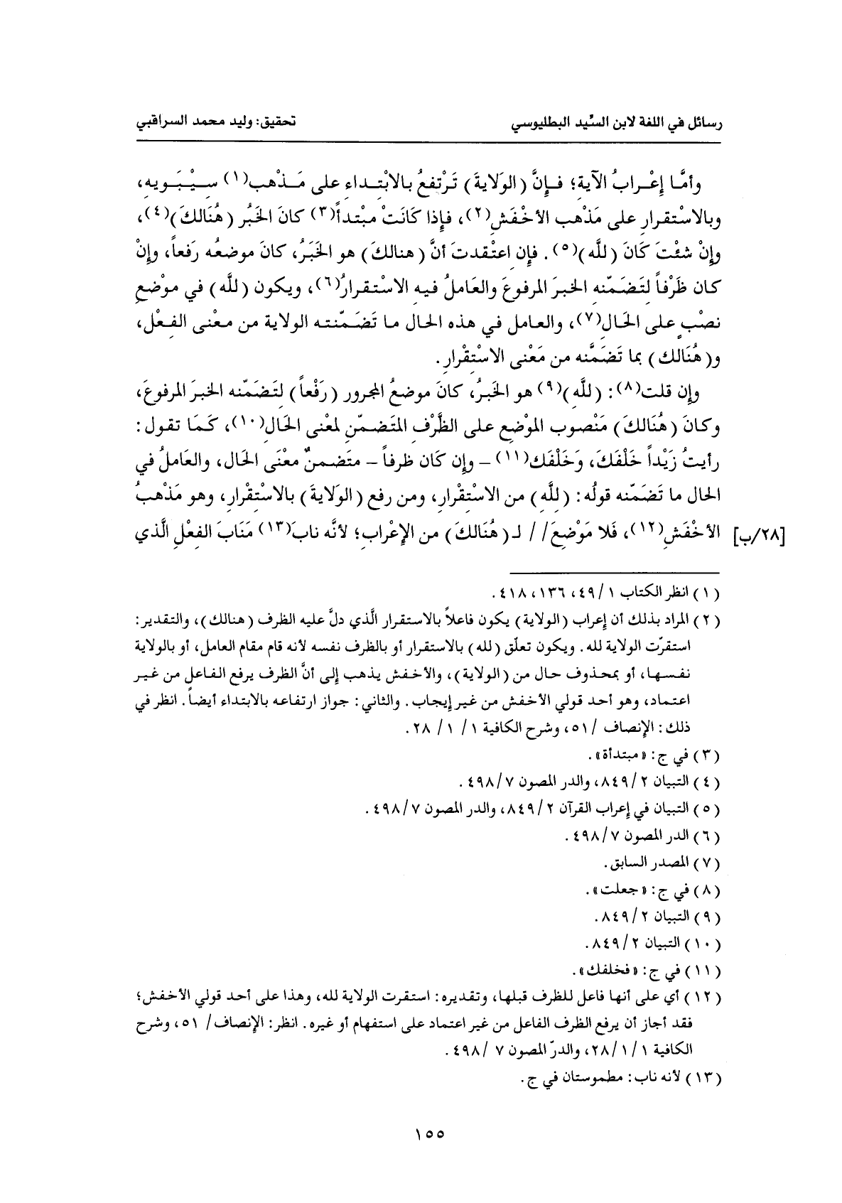 وأما إعراب الآية؛ فإن (الولاية) ترتفع بالابتداء على مذهب سيبويه، وبالاستقرار على مذهب الأخفش، فإذا كانت مبتدأ كان الخبر (هنالك)، وإن شئت كان (لله). فإن اعتقدت أن (هنالك) هو الخبر، كان موضعه رفعاً، وإن كان ظرفاً لتضمنه الخبر المرفوع والعامل فيه الاستقرار، ويكون (لله) في موضع نصب على الحال، والعامل في هذه الحال ما تضمنته الولاية من معنى الفعل، و (هنالك) بما تضمنه من معنى الاستقرار. وإن قلت: (لله) هو الخبر، كان موضع المجرور (رفعاً) لتضمنه الخبر المرفوع، وكان (هنالك) منصوب الموضع على الظرف المتضمن لمعنى الحال، كما تقول: رأيت زيداً خلفك، وخلفك _وإن كان ظرفاً_ متضمن معنى الحال، والعامل في الحال ما تضمنه قوله: (لله) من الاستقرار، ومن رفع (الولاية) بالاستقرار، وهو مذهب الأخفش، فلا موضع لـ (هنالك) عن الإعراب؛ لأنه ناب مناب الفعل الذي