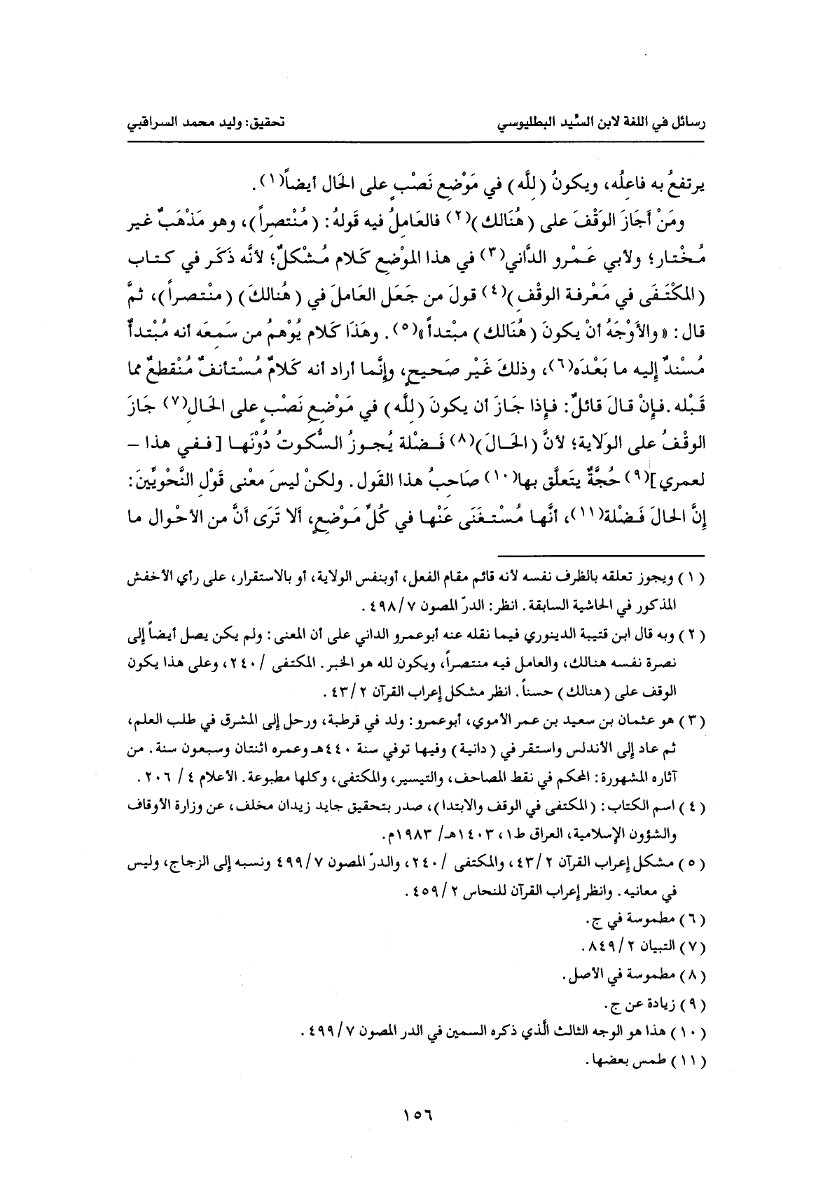 يرتفع به فاعله، ويكون (لله) في موضع نصب على الحال أيضاً. ومن أجاز الوقف على (هنالك) فالعامل فيه قوله: (منتصراً)، وهو مذهب غير مختار؛ ولأبي عمرو الداني في هذا الموضع كلام مشكل؛ لأنه ذكر في كتاب (المكتفي في معرفة الوقف) قول من جعل العامل في (هنالك) (منتصراً)، ثم قال: «والأوجه أن يكون (هنالك) مبتدأ». وهذا كلام يوهم من سمعه أنه مبتدأ مسند إليه ما بعده، وذلك غير صحيح، وإنما أراد أنه كلام مستأنف منقطع مما قبله. فإن قال قائل: فإذا جاز أن يكون (لله) في موضع نصب على الحال جاز الوقف على الولاية؛ لأن (الحال) فضلة يجوز السكوت دونها [ففي هذا _لعمري] حجة يتعلق بها صاحب هذا القول. ولكن ليس معنى قول النحويين: إن الحال فضلة، أنها مستغنى عنها في كل موضع، ألا ترى أن من الأحوال ما