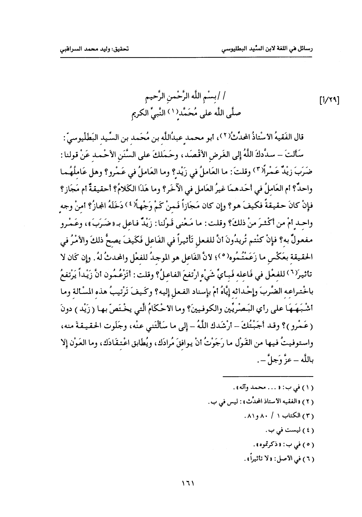 قال الفقيه الأستاذ المحدث، أبو محمد عبد الله بن محمد بن السيد البطليوسي: سألت _سددك الله إلى الغرض الأقصد، وحملك على السنن الأحمد عن قولنا: ضرب زيد عمراً وقلت: ما العامل في زيد؟ وما العامل في زيد؟ وما العامل في عمرو؟ وهل عاملها واحد؟ أم العامل في الآخر؟ وما هذا الكلام؟ أحقيقة أم مجاز؟ فإن كان حقيقة فكيف هو؟ وإن كان مجازاً فمن كم وجهاً دخله المجاز؟ أمن وجه واحد أم من أكثر من ذلك؟ وقلت: ما معنى قولنا: زيد فاعل بـ «ضرب»، وعمرو مفعول به؟ فإن كنتم تريدون أن للفعل تأثيرا في الفاعل فكيف يصح ذلك والأمر في الحقيقة بعكس ما زعمتوه؛ لأن الفاعل هو الموجد للفعل والمحدث له. وإن كان لا تأثير للفعل في فاعله فبأي شيء ارتفع الفاعل؟ وقلت: أتزعمون أن زيداً يرتفع باختراعه الضرب وإحداثه إياه أم بإسناد الفعل إليه؟ وكيف ترتيب هذه المسألة وما أشبهها على رأي البصريين والكوفيين؟ وما الأحكام التي يختص بها (زيد) دون (عمرو)؟ وقد أجبتك _أرشدك الله_ إلى ما سألتني عنه، وجلوت الحقيقة منه، واستوفيت فيها من القول ما رجوت أن يوافق مرادك، ويطابق اعتقادك، وما العون إلا بالله _عز وجل_.