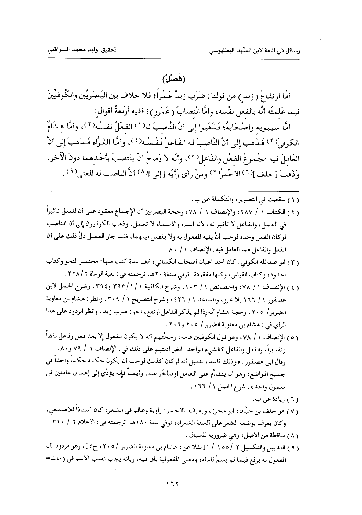 أما ارتفاع (زيد) من قولنا: ضرب زيد عمراً؛ فلا خلاف بين البصريين والكوفيين فيما علمته أنه بالفعل نفسه، وأما انتصاب (عمرو)؛ ففيه أربعة أقوال: أما سيبويه وأصحابه؛ فذهبوا إلى أن الناصب له الفعل نفسه، وأما هشام الكوفي فذهب إلى أن الناصب له الفاعل نفسه، وأما الفراء فذهب إلى أن العامل فيه مجموع الفعل والفاعل، وأنه لا يصح أن بنتصب بأحدهما دون الآخر. وذهب [خلف] الأحمر ومن رأى رأيه [إلى] أن الناصب له المعنى.