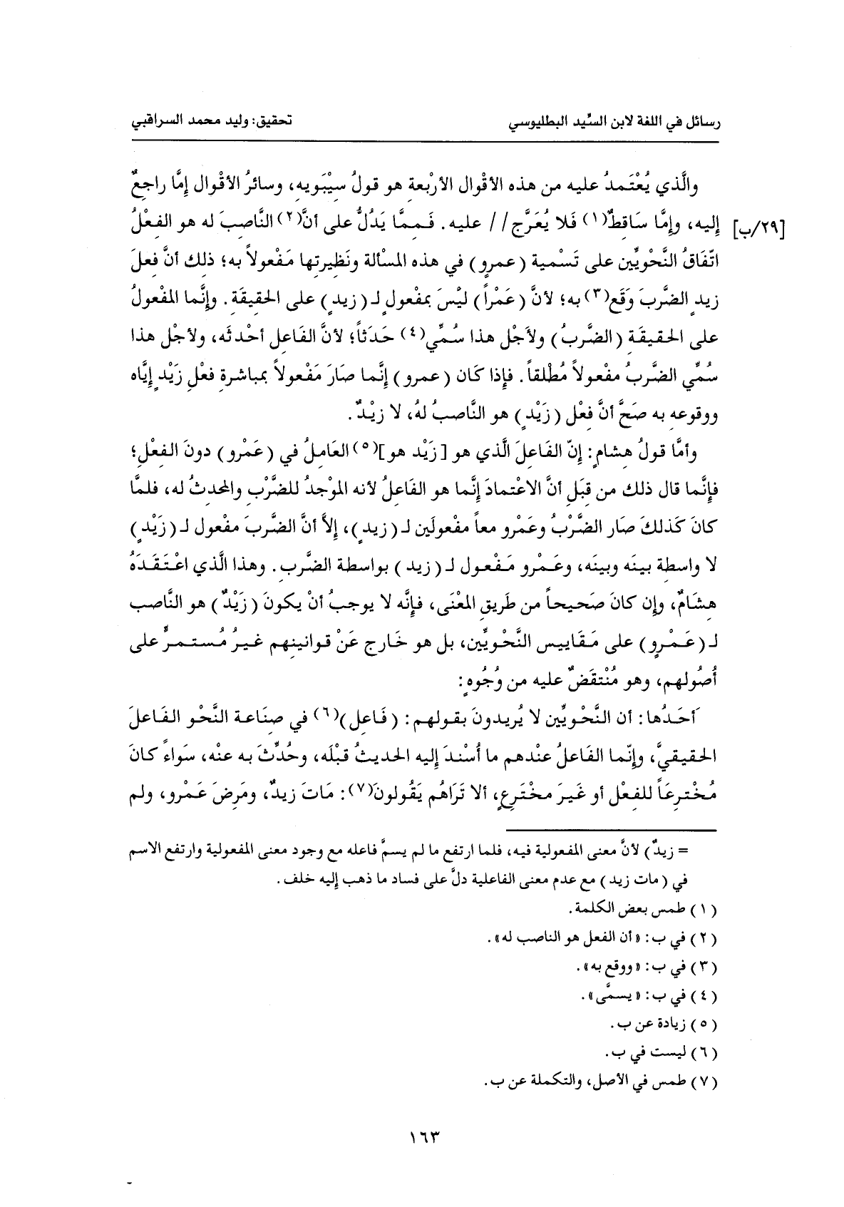 والذي يعتمد عليه من هذه الأقوال الأربعة هو قول سيبويه، وسائر الأقوال إما راجع إليه، وإما ساقط فلا يعرج عليه. فمما يدل على أن الناصب له هو الفعل اتفاق النحويين على تسمية (عمرو) في هذه المسألة ونظيرتها مفعولاً به؛ ذلك أن فعل زيد الضرب وقع به؛ لأن (عمراً) ليس بمفعول لـ (زيد) على الحقيقة. وإنما المفعول على الحقيقة (الضرب) ولأجل هذا سمي حدثاً؛ لأن الفاعل أحداثه، ولأجل هذا سمي الضرب مفعولاً مطلقاً. فإذا كان (عمرو) إنما صار مفعولاً بمباشرة فعل زيد إياه ووقوعه به صح أن فعل (زيد) هو الناصب له، لا زيد. وأما قول هشام: إن الفاعل الذي هو [زيد هو] العامل في (عمرو) دون الفعل؛ فإنما قال ذلك من قبل أن الاعتماد إنما هو الفاعل لأنه الموجد للضرب والمحدث له، فلما كان كذلك صار الضرب وعمرو معاً مفعولين لـ (زيد)، إلا أن الضرب مفعول لـ (زيد) لا واسطة بينه وبينه، وعمرو مفعول لـ (زيد) بواسطة الضرب. وهذا الذي اعتقده هشام. وإن كان صحيحاً من طريق المعنى، فإنه لا يوجد أن يكون (زيد) هو الناصب لـ (عمرو) على مقاييس النحويين، بل هو خارج عن قوانينهم غير مستمر على أصولهم، وهو منتقض عليه من وجوه: أحدهما: أن النحويين لا يريدون بقولهم: (فاعل) في صناعة النحو الفاعل الحقيقي، وإنما الفاعل عندهم ما أسند إليه الحديث قبله، وحدث به عنه، سواء كان مخترعاً للفعل أو غير مخترع، ألا تراهم يقولون: مات زيد، ومرض عمرو، ولم
