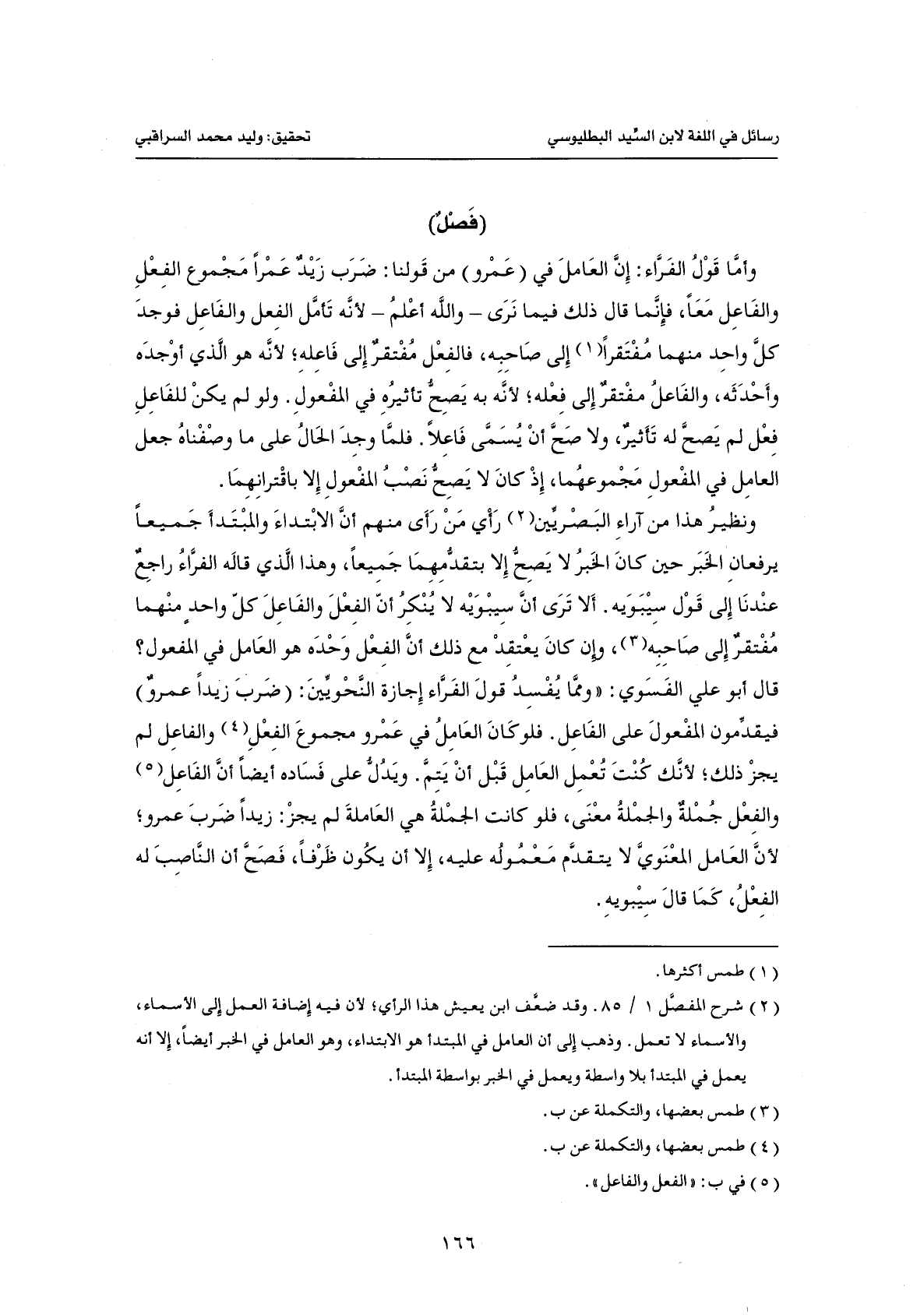 وأما قول الفراء: إن العامل في (عمرو) من قولنا: ضرب زيد عمراً مجموع الفعل والفاعل معاً، فإنما قال ذلك فيما نرى _والله أعلم_ لأنه تأمل الفعل والفاعل فوجد كل واحد منهما مفتقراً إلى صاحبه، فالفعل مفتقر إلى فاعله؛ لأنه هو الذي أوجده وأحدثه، والفاعل مفتقر إلى فعله؛ لأنه به يصبح تأثيره في المفعول. ولو لم يكن للفاعل فعل لم يصح له تأثيره، ولا صح أن يسمى فاعلاً. وجد الحال على ما وصفناه جعل العامل في المفعول مجموعهما، إذ كان لا يصح نصب المفعول إلا باقترانهما. ونظير هذا من آراء البصريين رأي من رأى منهم أن الابتداء والمبتدأ جميعاً يرفعان الخبر حين كان الخبر لا يصح إلا بتقدمهما جميعاً، وهذا الذي قاله الفراء راجع عندنا إلى قول سيبويه. ألا ترى أن سيبويه لا ينكر أن الفعل والفاعل كل واحد منهما مفتقر إلى صاحبه، وإن كان يعتقد مع ذلك أن الفعل وحده هو العامل في المفعول؟ قال أبو علي القسوي: «ومما يفسد قول الفراء إجازة النحويين: (ضرب زيداً عمرو) فيقدمون المفعول على الفاعل. فلو كان العامل في عمرو مجموع الفعل والفاعل لم يجز ذلك؛ لأنك كنت تعمل العامل قبل أن يتم. ويدل على فساده أيضاً أن الفاعل والفعل جملة والجملة معنى، فلو كانت الجملة هي العاملة لم يجز: زيداً ضرب عمرو؛ لأن العامل المعنوي لا يتقدم معموله عليه، إلا أن يكون ظرفاً، فصح أن الناصب له الفعل، كما قال سيبويه.