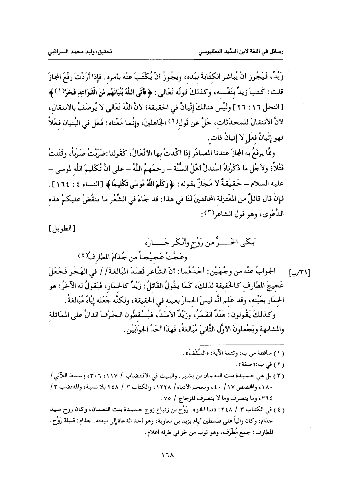 زيد، فيجوز أن يباشر الكتابة بيده، ويجوز أن يكتب عنه بأمره. فإذا أردت رفع المجاز قلت: كتب زيد بنفسه، وكذلك قوله تعالى: {فَأَتَى اللَّهُ بُنْيَانَهُمْ مِنَ الْقَوَاعِدِ فَخَرَّ} [النحل 26: 16] وليس هنالك إتيان في الحقيقة؛ لأن الله تعالى لا يوصف بالانتقال، لأن الانتقال للمحدثات، جل عن قول الجاهلين، وإنما معناه: فعل في البنيان فعلاً فهو إتيان فعل لا إتيان ذات. ومما يرفع به المجاز عندنا المصادر إذا أكدت بها الأفعال، كقولنا: ضربت ضرباً، وقتلت قتلا؛ ولأجل ما ذكرناه استدل أهل السنة _رحمهم الله_على أن تكليم الله لموسى_ عليه السلام_ حقيقة لا مجاز بقوله: {وَكَلَّمَ اللَّهُ مُوسَى تَكْلِيماً} [النساء 164: 4] فإن قال قائل من المعتزلة المخالفين لنا في هذا: قد جاء في الشعر ما ينقض عليكم هذه الدعوى، وهو قول الشاعر: