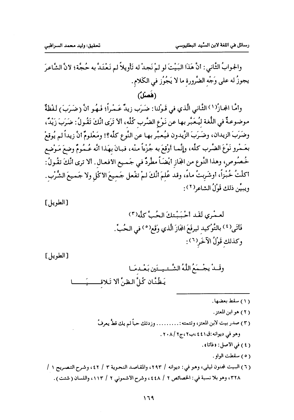 وأما المجاز الثاني الذي في قولنا: ضرب زيد عمراً؛ فهو أن (ضرب) لفظة موضوعة في اللغة ليعبر بها عن نوع الضرب كله، ألا ترى أنك تقول: ضرب زيد، وضرب الزيدان، وضرب الزيدون فيعبر بها عن النوع كله؟ ! ومعلوم أن زيداً لم يوقع بعمرو نوع الضرب كله، وإنما أوقع به جزءاً منه، فبان بهذا أنه عموم وضع موضع خصوص، وهذا النوع من المجاز أيضاً مطرد في جميع الأفعال. ألا ترى أنك تقول: أكلت خبزاً، أو شربت ماء، وقد علم أنك لم تفعل جميع الأكل ولا جميع الشرب. ويبين ذلك قول الشاعر: