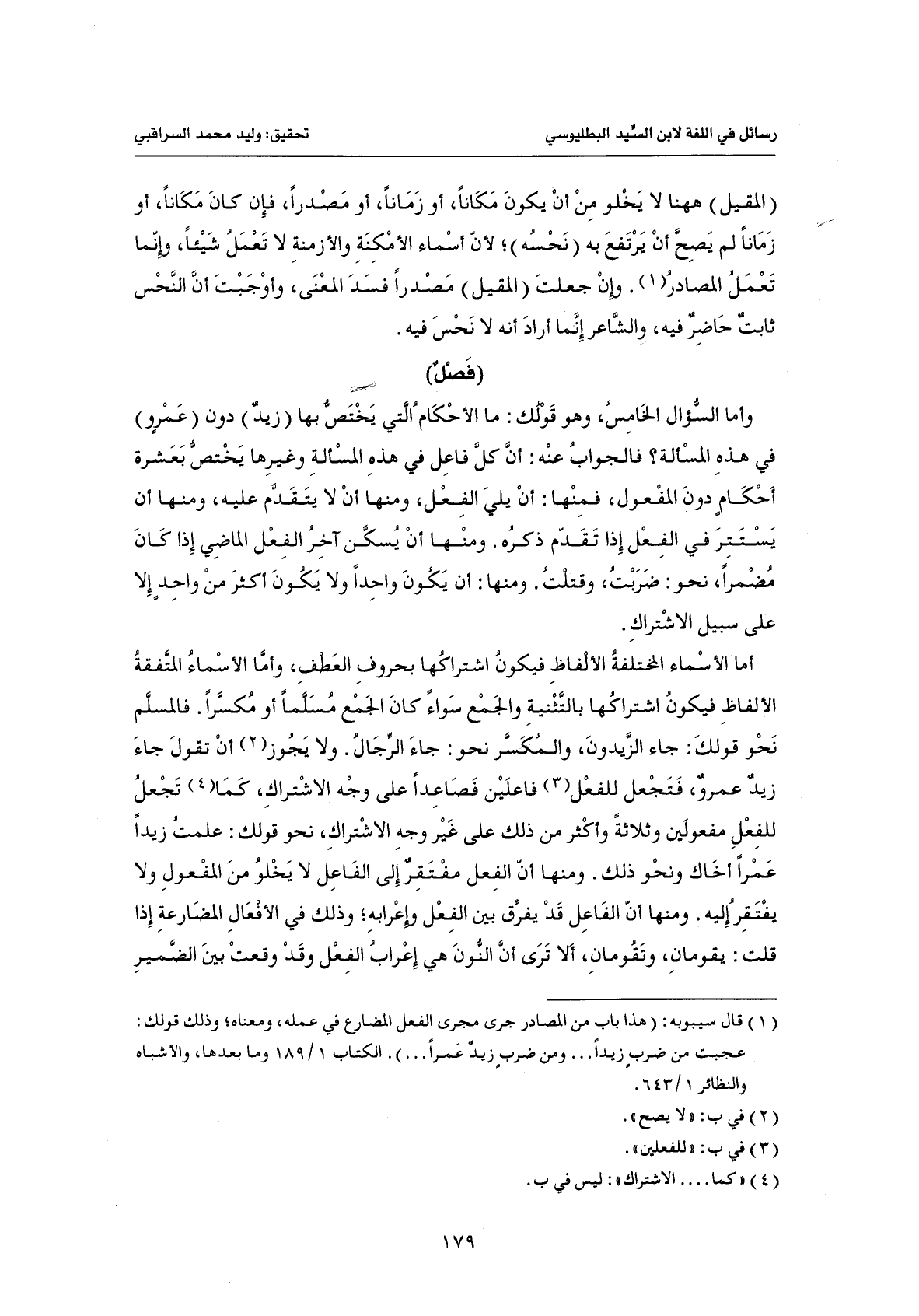 وأما السؤال الخامس، وهو قولك: ما الأحكام التي يختص بها (زيد) دون (عمرو) في هذه المسألة؟ فالجواب عنه: أن كل فاعل في هذه المسألة وغيرها يختص بعشرة أحكام دون المفعول، فمنها: أن يلي الفعل، ومنها أن لا يتقدم عليه، ومنها أن يستتر في الفعل إذا تقدم ذكره. ومنها أن يسكن آخر الفعل الماضي إذا كان مضمراً، نحو: ضربت، وقتلت. ومنها: أن يكون واحداً ولا يكون أكثر من واحد إلا على سبيل الاشتراك. أما الأسماء المختلفة الألفاظ فيكون اشتراكها بحروف العطف، وأما الأسماء المتفقة الألفاظ فيكون اشتراكها بالتثنية والجمع سواء كان الجمع مسلماً أو مكسراً. فالمسلم نحو قولك: جاء الزيدون، والمكسر نحو: جاء الرجال. ولا يجوز أن تقول جاء زيد عمرو، فتجعل للفعل فاعلين فصاعداً على وجه الاشتراك، كما تجعل للفعل مفعولين وثلاثة وأكثر من ذلك على غير وجه الاشتراك، نحو قولك: علمت زيداً عمراً أخاك ونحو ذلك. ومنها أن الفعل مفتقر إلى الفاعل لا يخلو من المفعول ولا يفتقر إليه. ومنها أن الفاعل قد يفرق بين الفعل وإعرابه؛ وذلك في الأفعال المضارعة إذا قلت: يقومان، وتقومان، ألا ترى أن النون هي إعراب الفعل وقد وقعت بين الضمير