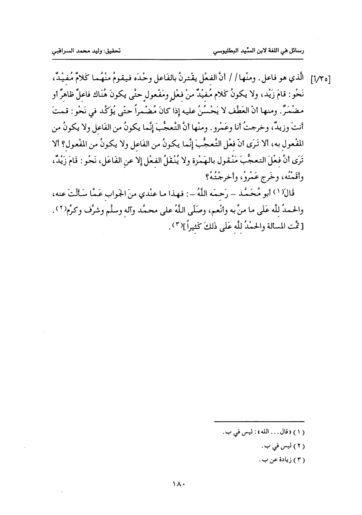 الذي هو فاعل. ومنها// أن الفعل يقترن بالفاعل وحده فيقوم منهما كلام مفيد، نحو: قام زيد، ولا يكون كلام مفيد من فعل ومفعول حتى يكون هناك فاعل ظاهر أو مضمر. زمنها أن العطف لا يحسن عليه إذا كان مضمراً حتى يؤكد في نحو: قمت أنت وزيد، وخرجت أنا وعمرو. ومنها أن التعجب إنما يكون من الفاعل ولا يكون من المفعول به، ألا ترى أن فعل التعجب إنما يكون من الفاعل ولا يكون من المفعول؟ ألا ترى أن فعل التعجب منقول بالهمزة ولا ينقل الفعل إلا عن الفاعل، نحو: قام زيد، وأقمته، وخرج عمرو، وأخرجته؟ قال أبو محمد _رحمة الله_: فهذا ما عندي من الجواب عما سألت عنه، والحمد لله على ما من به وأنعم، وصلى الله على محمد وآله وسلم وشرف وكرم. [تمت المسألة والحمد لله على ذلك كثيراً].