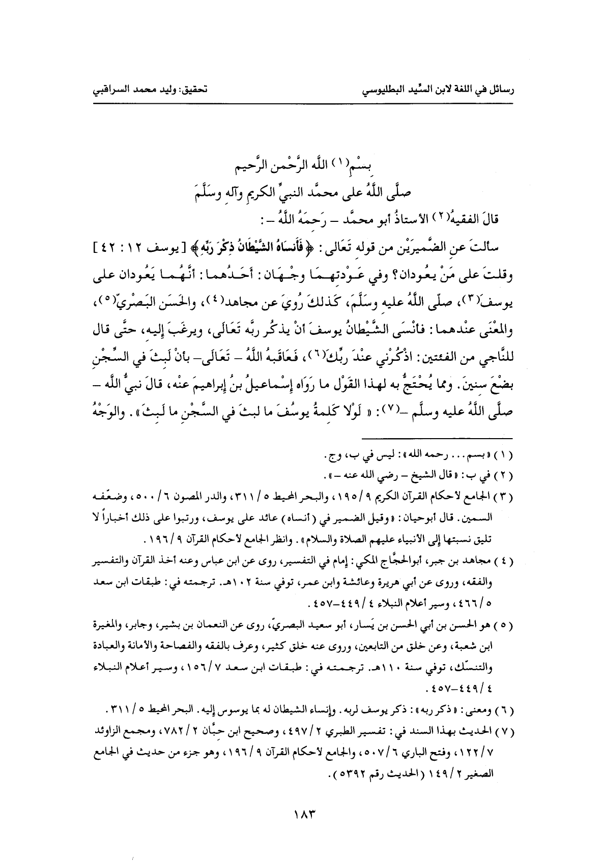 سألت عن الضميرين من قوله تعالى: {فَأَنْسَاهُ الشَّيْطَانُ ذِكْرَ رَبِّهِ} [يوسف: 42]، وقلت على من يعودان؟ وفي عودتهما وجهان أحدهما: أنهما يعودان على يوسف، صلى الله عليه وسلم، وكذلك روي عن مجاهد، والحسن البصري، والمعنى عندهما: فأنسى الشيطان يوسف أن يذكر ربه تعالى، ويرغب إليه، حتى قال للناجي من الفئتين: اذكرني عند ربك، فعاقبه الله- تعالى- بأن لبث في السجن بضع سنين، ومما يحتج به لهذا القول ما رواه إسماعيل بن إبراهيم عنه، قال نبي الله- صلى الله عليه وسلم-: «لولا كلمة يوسف ما لبث في السجن ما لبث». والوجه