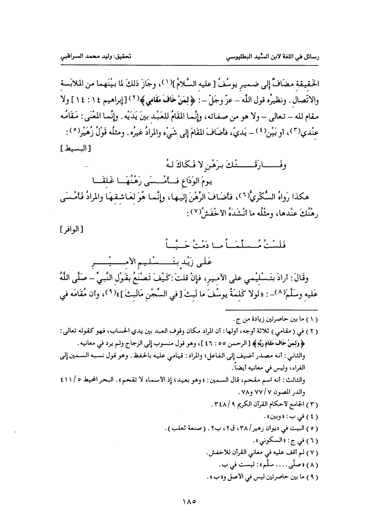 الحقيقة مضاف إلى ضمير يوسف [عليه السلام]، وجاز ذلك لما بينهما من الملابسة والاتصال، ونظيره قول الله- عز وجل-: {لِمَنْ خَافَ مَقَامِي} [إبراهيم: 14] ولا مقام لله- تعالى- ولا هو من صفاته، وإنما المقام للعبد بين يديه، وإنما المعنى: مقامه عندي، أو بين- يدي، فأضاف المقام إلى شيء والمراد غيره، ومثله قول زهير: