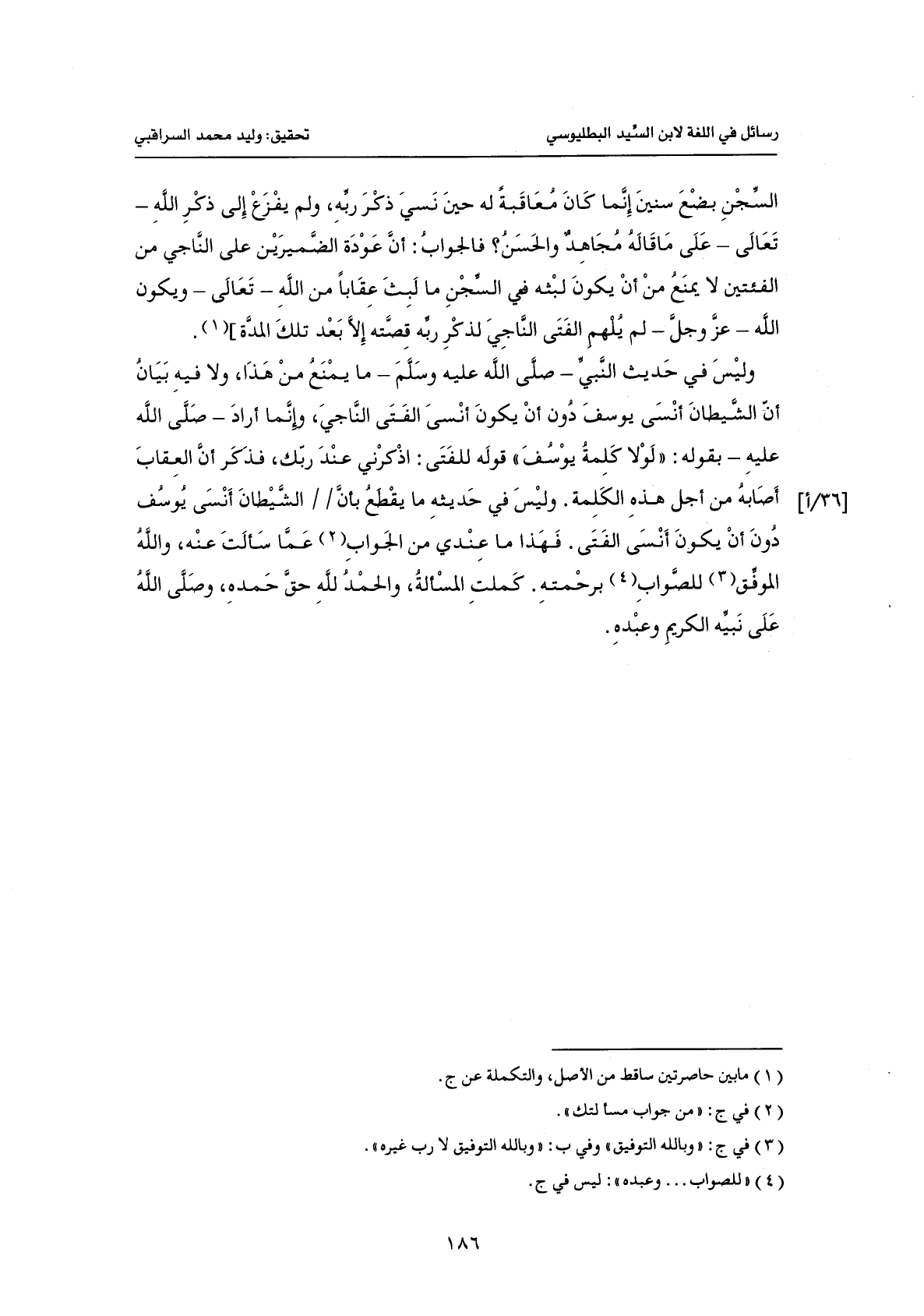 وليس في حديث النبي- صلى الله عليه وسلم- ما يمنع من هذا، ولا فيه بيان أن الشيطان أنسى يوسف دون أن يكون أنسى الفتى الناجين، وإنما أراد- صلى الله عليه- بقوله: «لولا كلمة يوسف» قوله للفتى: اذكرني عند ربك، فذكر أن العقاب أصابه من أجل هذه الكلمة، وليس في حديثه ما يقطع بأن// الشيطان أنسى يوسف دون أن يكون أنسى الفتى، فهذا ما عندي من الجواب عما سألت عنه، والله الموفق للصواب برحمته، كملت المسألة، والحمد لله حق حمده، وصلى الله على نبيه الكريم وعبده.