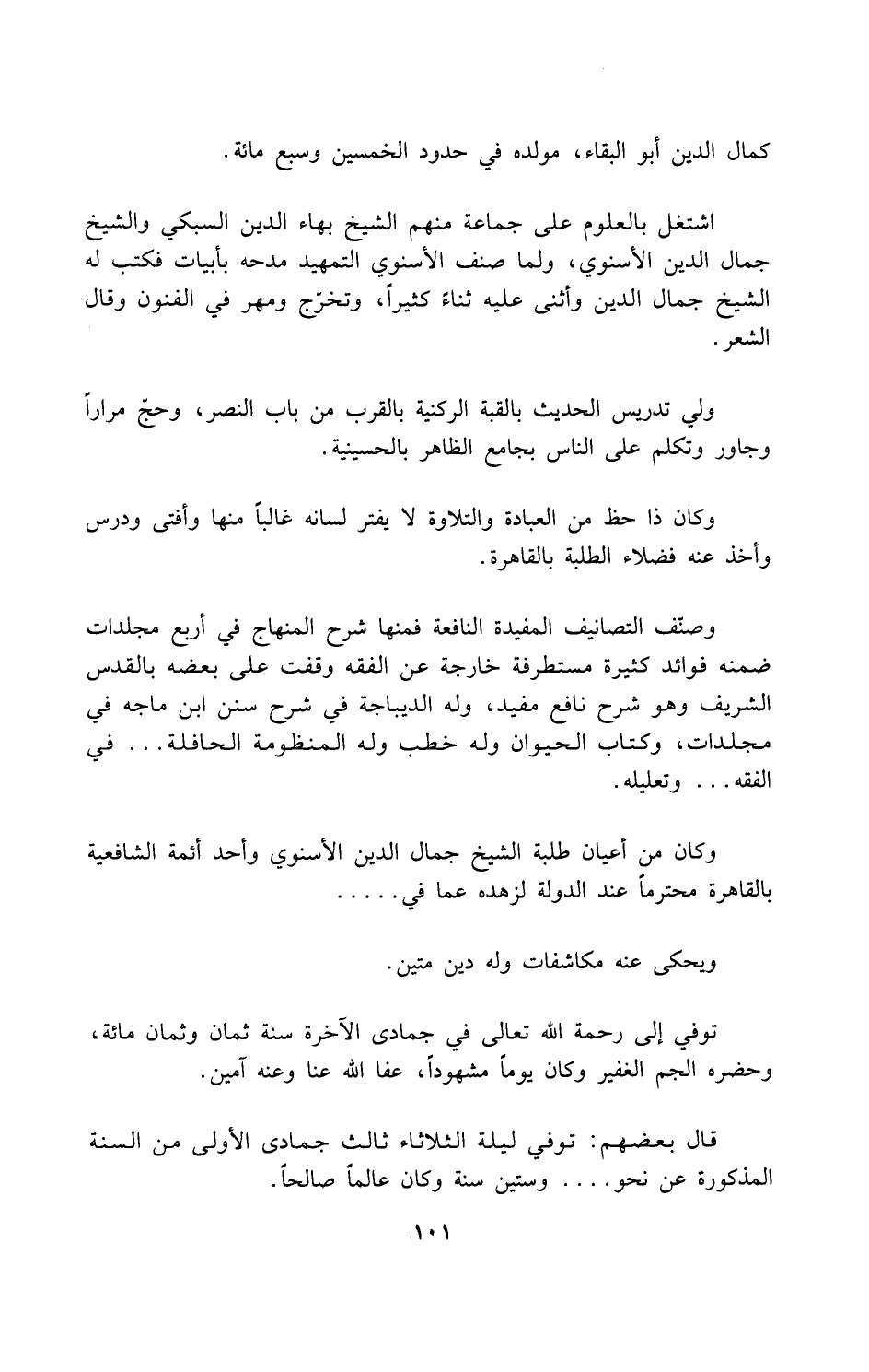 وكان من أعيان طلبة الشيخ جمال الدين الأسنوي وأحد أئمة الشافعية بالقاهرة محترماً عند الدولة لزهده عما في. . . . .