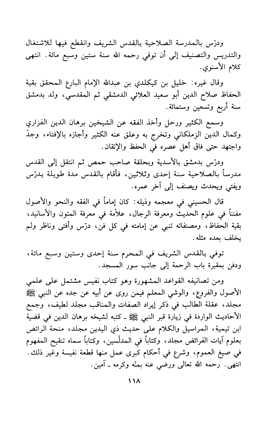 ودرّس بالمدرسة الصلاحية بالقدس الشريف وانقطع فيها للاشتغال والتدريس والتصنيف إلى أن توفي رحمه الله سنة ستين وسبع مائة. انتهى كلام الأسنوي.