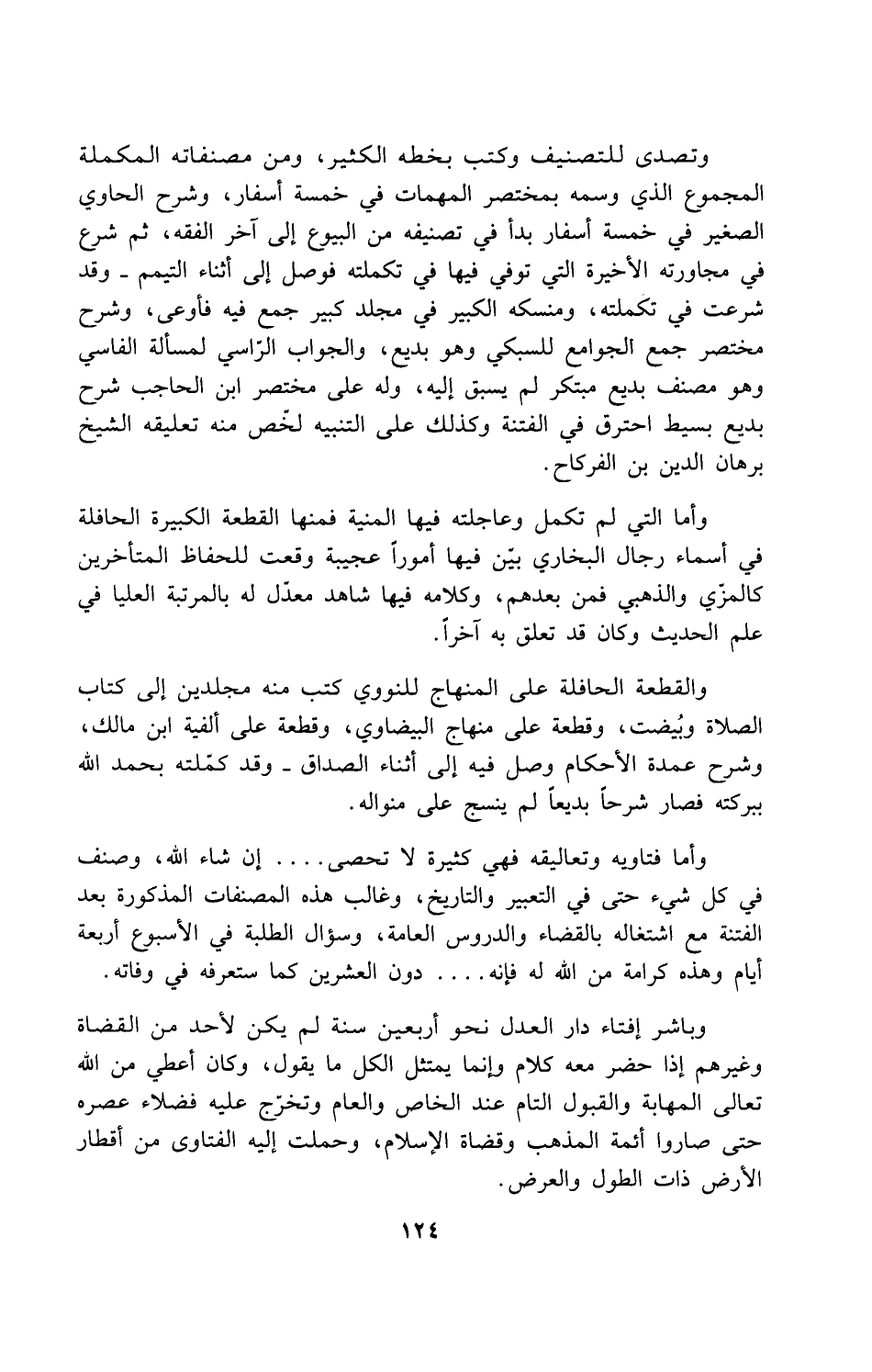 والقطعة الحافلة على المنهاج للنووي كتب منه مجلدين إلى كتاب الصلاة وبُيضت، وقطعة على منهاج البيضاوي، وقطعة على ألفية ابن مالك، وشرح عمدة الأحكام وصل فيه إلى أثناء الصداق -وقد كمّلته بحمد الله ببركته فصار شرحاً بديعاً لم ينسج على منواله.