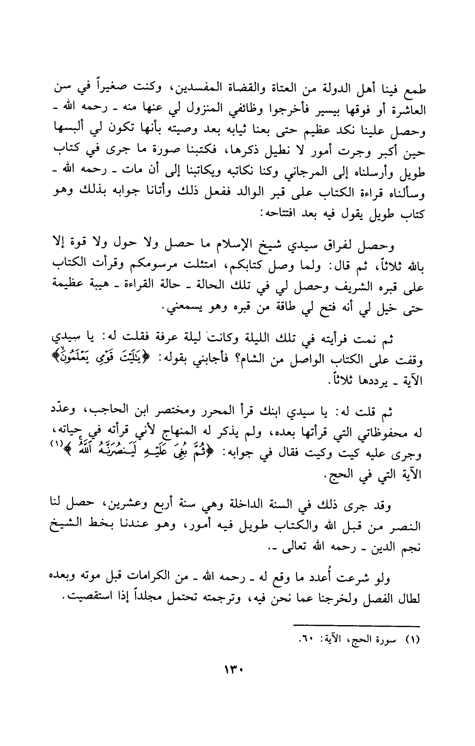 ثم قلت له: يا سيدي ابنك قرأ المحرر ومختصر ابن الحاجب، وعدّد له محفوظاتي التي قرأتها بعده، ولم يذكر له المنهاج لأني قرأته في حياته، وجرى عليه كيت وكيت فقال في جوابه: {ثُمَّ بُغِيَ عَلَيْهِ لَيَنْصُرَنَّهُ اللَّهُ} (¬1) الآية التي في الحج.