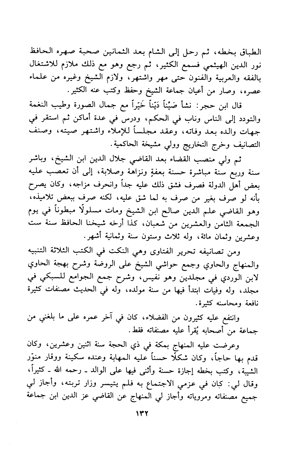 ومن تصانيفه تحرير الفتاوى وهي النكت في الكتب الثلاثة التنبيه والمنهاج والحاوي وجمع حواشي الشيخ على الروضة وشرح بهجة الحاوي لابن الوردي في مجلدين وهو نفيس، وشرح جمع الجوامع للسبكي في مجلد، وله وفيات ابتدأ فيها من سنة مولده، وله في الحديث مصنفات كثيرة نافعة ومحاسنه كثيرة.