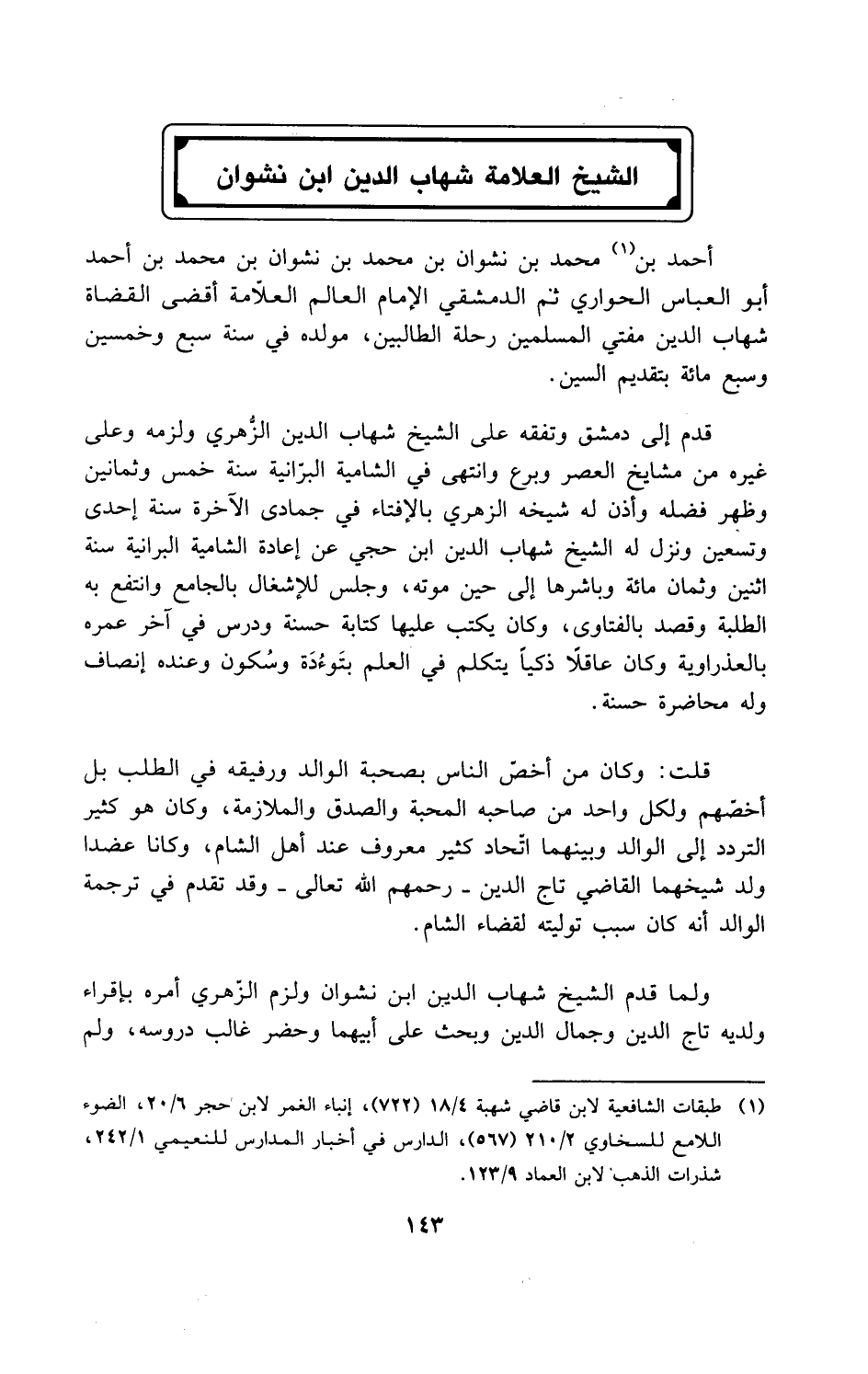 أحمد بن (¬1) محمد بن نشوان بن محمد بن نشوان بن محمد بن أحمد أبو العباس الحواري ثم الدمشقي الإمام العالم العلَّامة أقضى القضاة شهاب الدين مفتي المسلمين رحلة الطالبين، مولده في سنة سبع وخمسين وسبع مائة بتقديم السين.