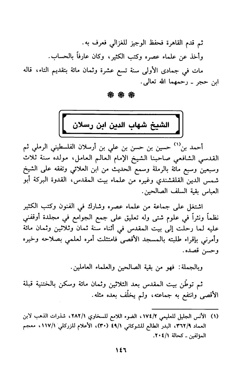 أحمد بن (¬1) حسين بن حسن بن علي بن أرسلان الفلسطيني الرملي ثم القدسي الشافعي صاحبنا الشيخ الإمام العالم العامل، مولده سنة ثلاث وسبعين وسبع مائة بالرملة وسمع الحديث من ابن العلائي وتفقه على الشيخ شمس الدين القلقشندي وغيره من علماء بيت المقدس، القدوة البركة أبو العباس بقية السلف الصالحين.