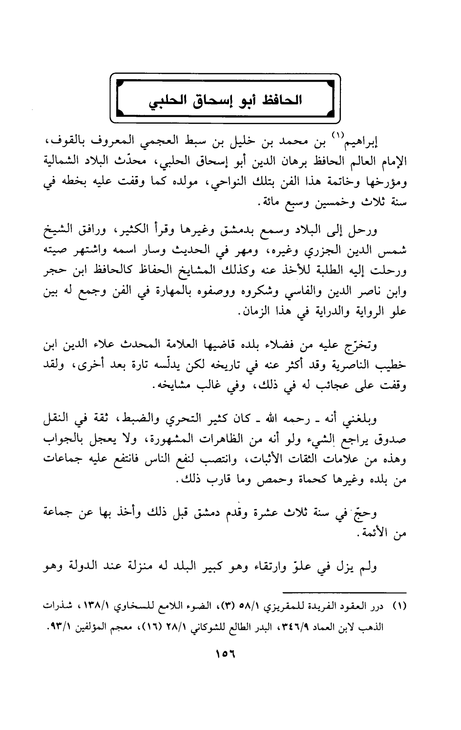 إبراهيم (¬1) بن محمد بن خليل بن سبط العجمي المعروف بالقوف، الإمام العالم الحافظ برهان الدين أبو إسحاق الحلبي، محدّث البلاد الشمالية ومؤرخها وخاتمة هذا الفن بتلك النواحي، مولده كما وقفت عليه بخطه في سنة ثلاث وخمسين وسبع مائة.