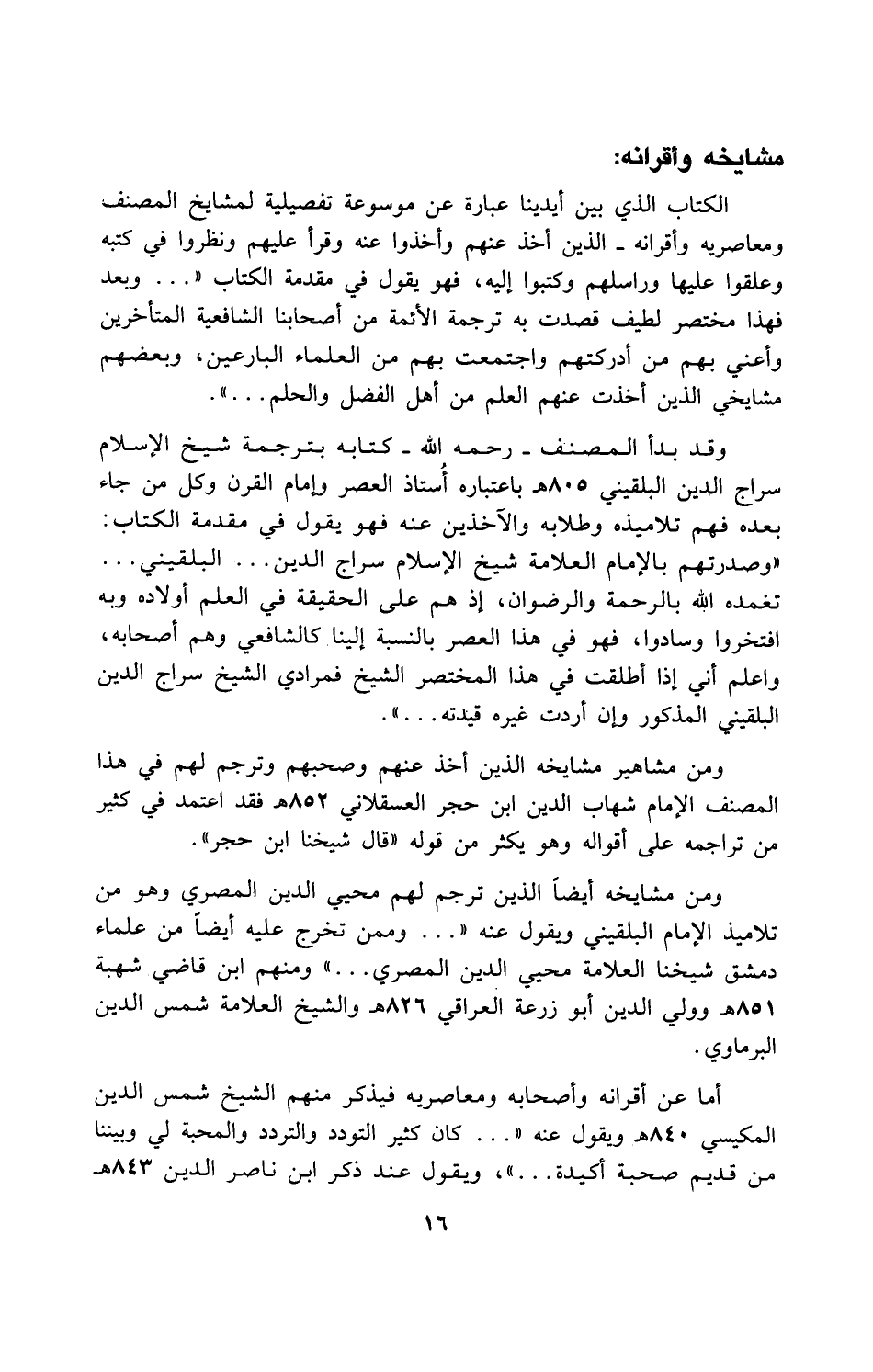 وقد بدأ المصنف -رحمه الله- كتابه بترجمة شيخ الإسلام سراج الدين البلقيني 805 هـ باعتباره أُستاذ العصر وإمام القرن وكل من جاء بعده فهم تلاميذه وطلابه والآخذين عنه فهو يقول في مقدمة الكتاب: "وصدرتهم بالإمام العلامة شيخ الإسلام سراج الدين. . . البلقيني. . . تغمده الله بالرحمة والرضوان، إذ هم على الحقيقة في العلم أولاده وبه افتخروا وسادوا، فهو في هذا العصر بالنسبة إلينا كالشافعي وهم أصحابه، واعلم أني إذا أطلقت في هذا المختصر الشيخ فمرادي الشيخ سراج الدين البلقيني المذكور وإن أردت غيره قيدته. . . ".