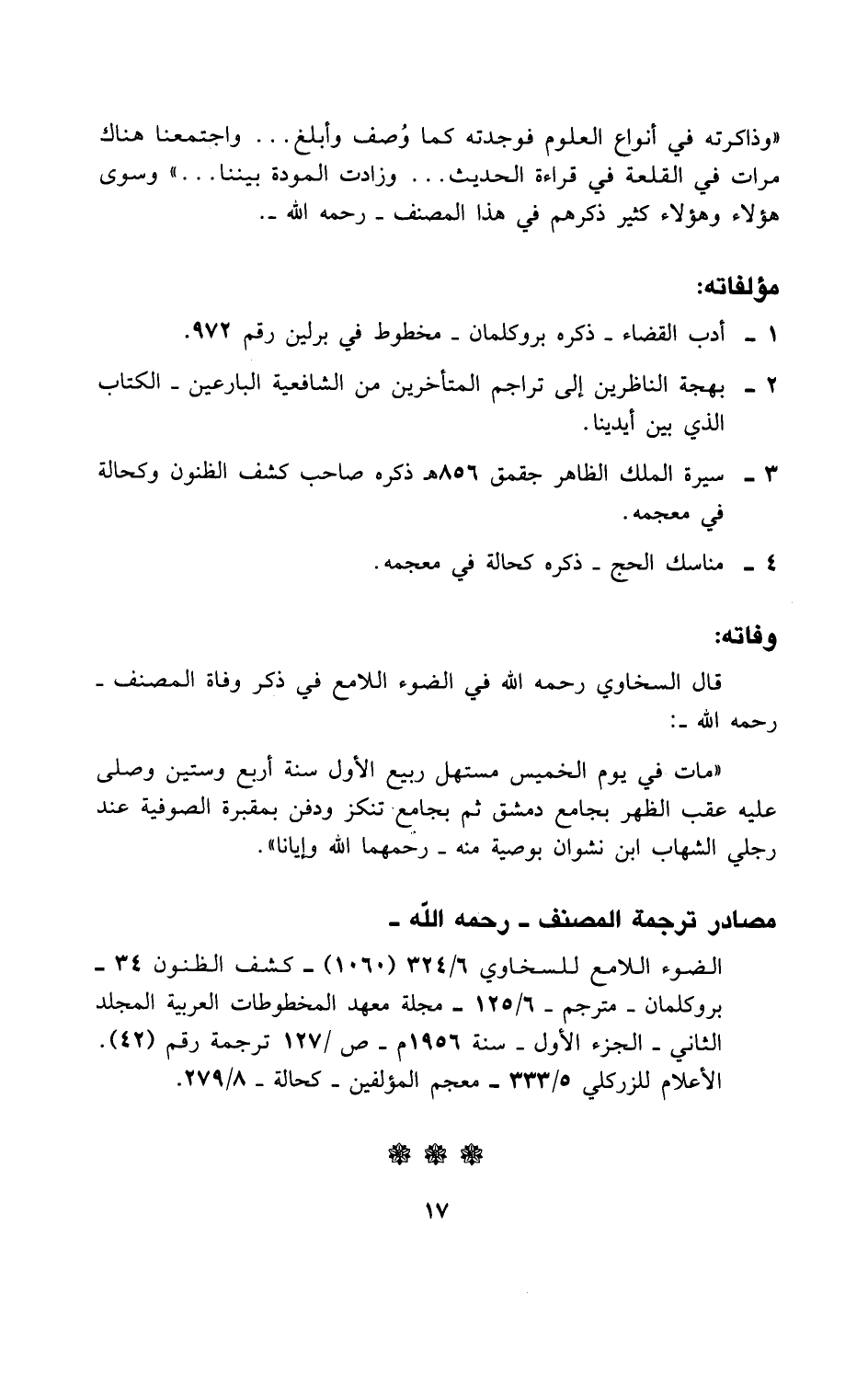 قال السخاوي رحمه الله في الضوء اللامع في ذكر وفاة المصنف -رحمه الله-: