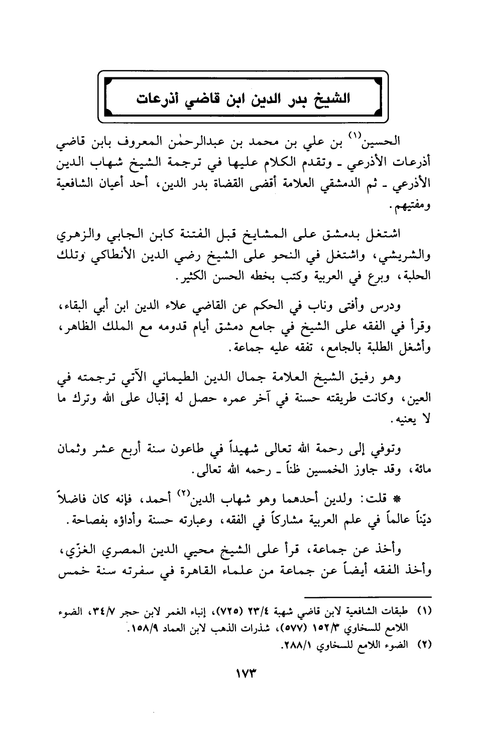 الحسين (¬1) بن علي بن محمد بن عبد الرحمن المعروف بابن قاضي أذرعات الأذرعي -وتقدم الكلام عليها في ترجمة الشيخ شهاب الدين الأذرعي- ثم الدمشقي العلامة أقضى القضاة بدر الدين، أحد أعيان الشافعية ومفتيهم.