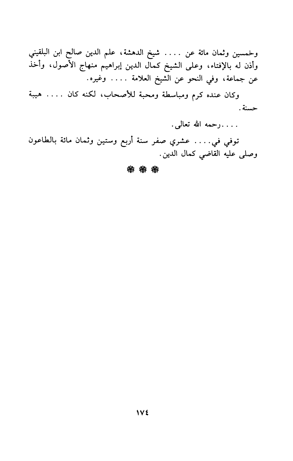 وخمسين وثمان مائة عن. . . . شيخ الدهشة، علم الدين صالح ابن البلقيني وأذن له بالإفتاء، وعلى الشيخ كمال الدين إبراهيم منهاج الأصول، وأخذ عن جماعة، وفي النحو عن الشيخ العلامة. . . . وغيره.