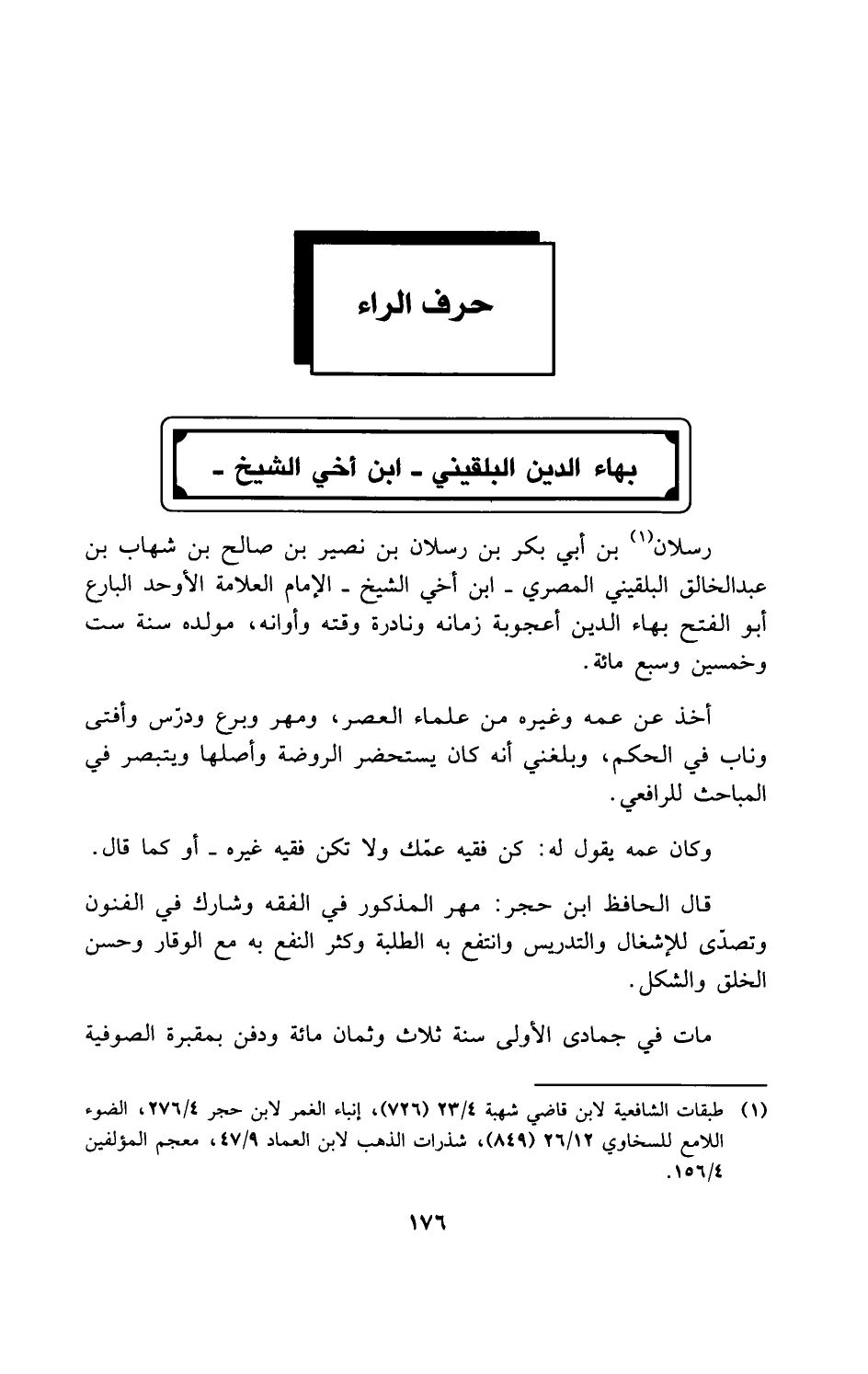 رسلان (¬1) بن أبي بكر بن رسلان بن نصير بن صالح بن شهاب بن عبد الخالق البلقيني المصري -ابن أخي الشيخ- الإِمام العلامة الأوحد البارع أبو الفتح بهاء الدين أعجوبة زمانه ونادرة وقته وأوانه، مولده سنة ست وخمسين وسبع مائة.