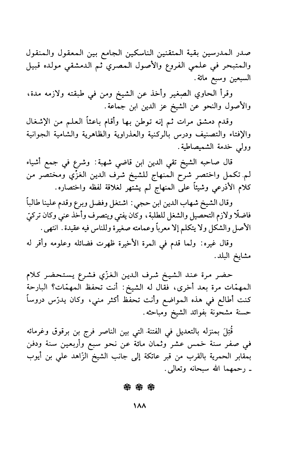 صدر المدرسين بقية المتقنين الناسكين الجامع بين المعقول والمنقول والمتبحر في علمي الفروع والأصول المصري ثم الدمشقي مولده قبيل السبعين وسبع مائة.