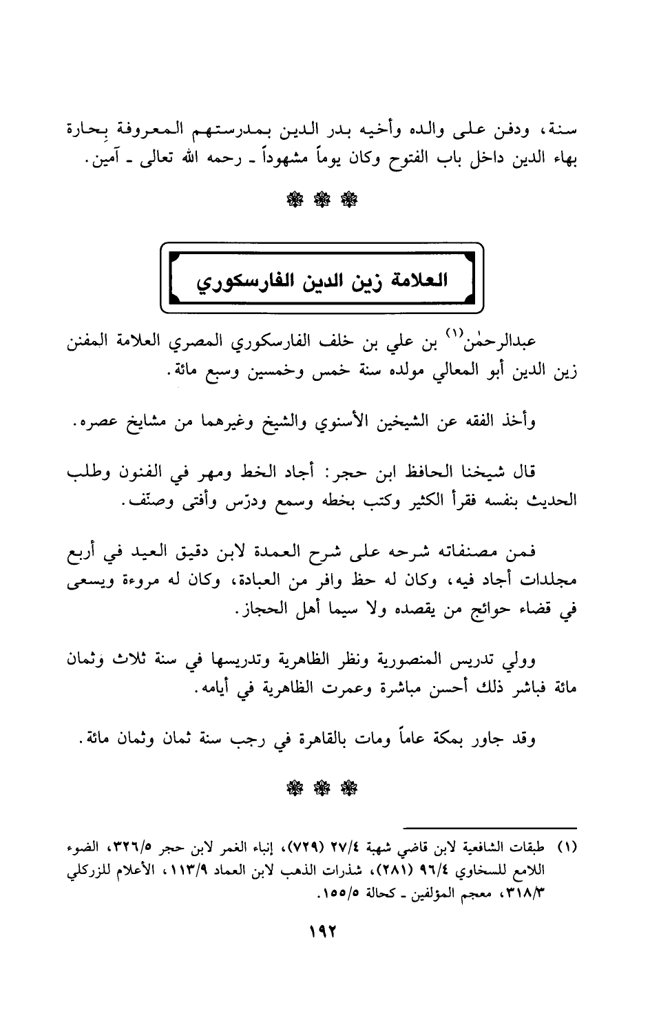 عبد الرحمن (¬1) بن علي بن خلف الفارسكوري المصري العلامة المفنن زين الدين أبو المعالي مولده سنة خمس وخمسين وسبع مائة.