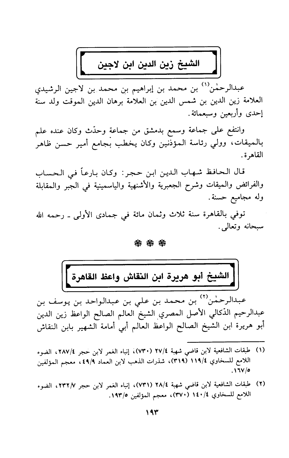(¬2) طبقات الشافعية لابن قاضي شهبة 4/ 28 (731)، إنباء الغمر لابن حجر 7/ 232، الضوء اللامع للسخاوي 4/ 140 (370)، معجم المؤلفين 5/ 193.