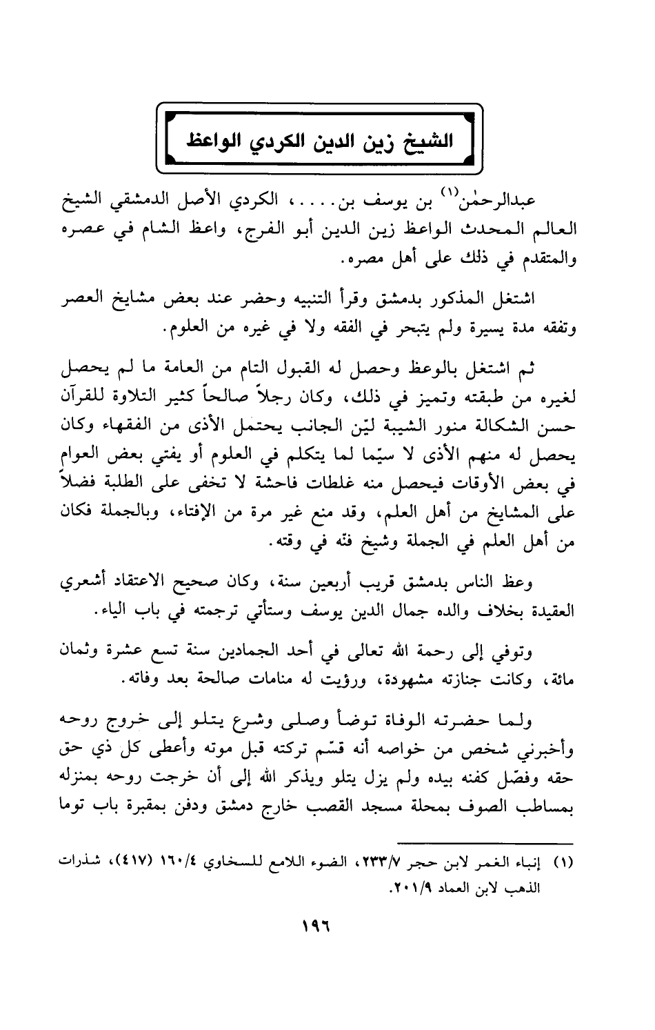 عبد الرحمن (¬1) بن يوسف بن. . . .، الكردي الأصل الدمشقي الشيخ العالم المحدث الواعظ زين الدين أبو الفرج، واعظ الشام في عصره والمتقدم في ذلك على أهل مصره.