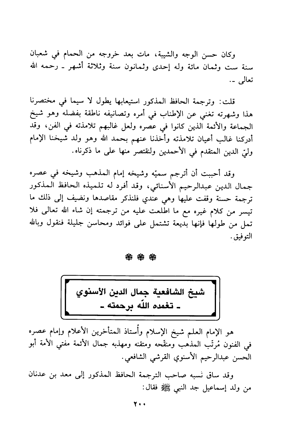 وقد أحببت أن أترجم سميّه وشيخه إمام المذهب وشيخه في عصره جمال الدين عبد الرحيم الأسنائي، وقد أفرد له تلميذه الحافظ المذكور ترجمة حسنة وقفت عليها وهي عندي فلنذكر مقاصدها ونضيف إلى ذلك ما تيسر من كلام غيره مع ما اطلعت عليه من ترجمته إن شاء الله تعالى فلا تمل من طولها فإنها بديعة تشتمل على فوائد ومحاسن جليلة فنقول وبالله التوفيق.