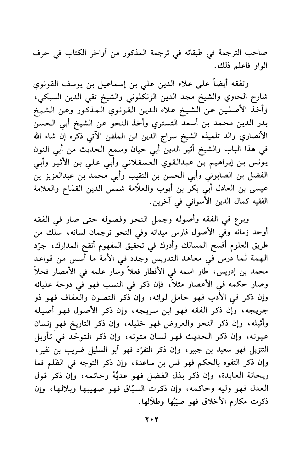 وبرع في الفقه وأصوله وجمل النحو وفصوله حتى صار في الفقه أوحد زمانه وفي الأصول فارس ميدانه وفي النحو ترجمان لسانه، سلك من طريق العلوم أفسح المسالك وأدرك في تحقيق المفهوم أنقح المدارك، جرّد الهمة لما درس في معاهد التدريس وجدد في الأمة ما أسس من قواعد محمد بن إدريس، طار اسمه في الأقطار فعلًا وسار علمه في الأمصار فحلاً وصار حكمه في الأعصار مثلًا، فإن ذكر في النسب فهو في دوحة عليائه وأن ذكر في الأدب فهو حامل لوائه، وأن ذكر التصون والعفاف فهو ذو جريجه، وإن ذكر الفقه فهو ابن سريجه، وإن ذكر الأصول فهو أصيله وأثيله، وإن ذكر النحو والعروض فهو خليله، وإن ذكر التاريخ فهو إنسان عيونه، وإن ذكر الحديث فهو لسان متونه، وإن ذكر التوحّد في تأويل التنزيل فهو سعيد بن جبير، وإن ذكر التفرّد فهو أبو السليل ضريب بن نفير، وإن ذكر التفوه بالحكم فهو قس بن ساعدة، وإن ذكر التوجه في الظلم فما ريحانة العابدة، وإن ذكر بذل الفضل فهو عديُّهُ وحاتمه، وإن ذكر قول العدل فهو وليّه وحاكمه، وإن ذكرت السباق فهو صهيبها وبلالها، وإن ذكرت مكارم الأخلاق فهو صيّبُها وطلاَلها.