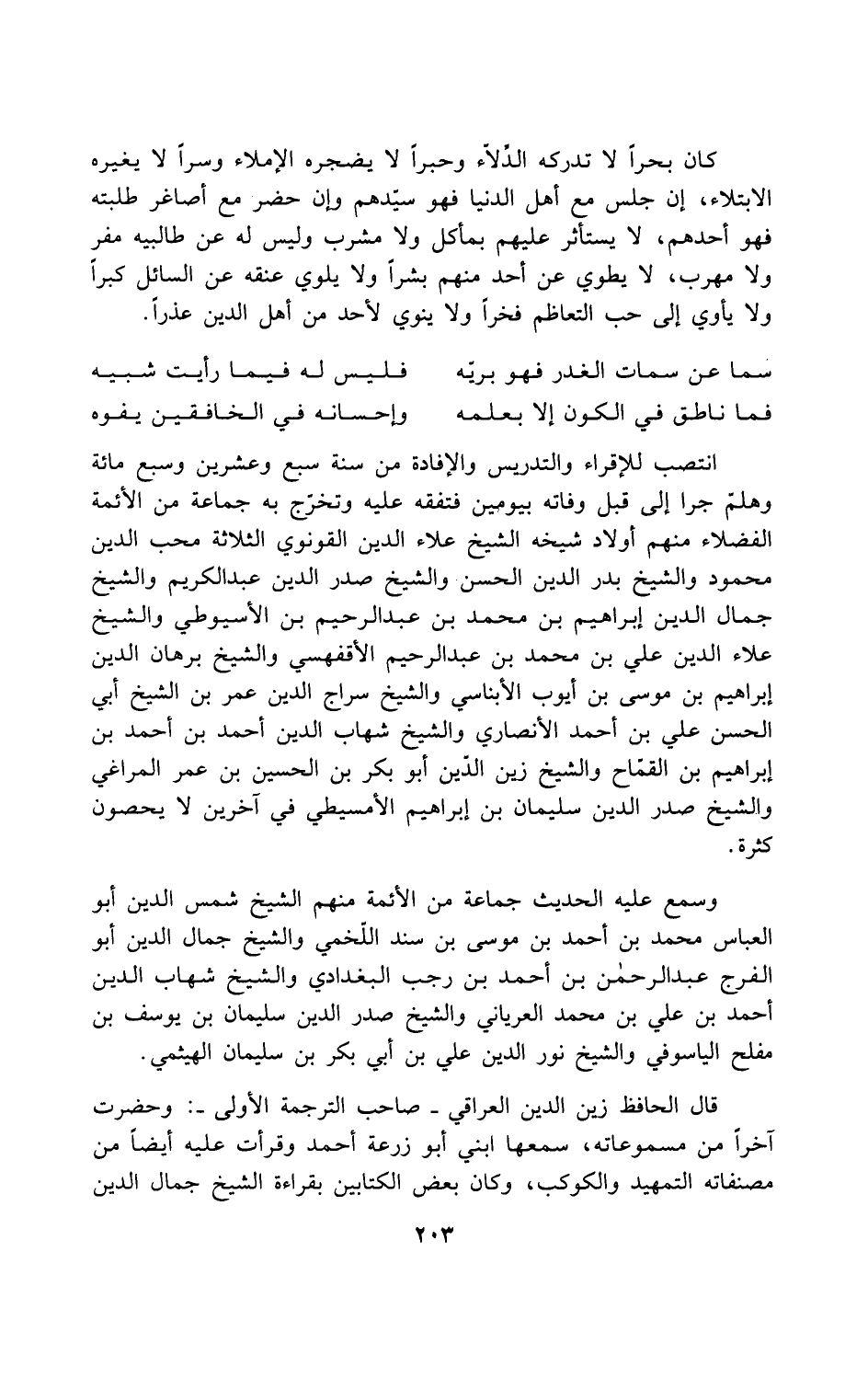 كان بحراً لا تدركه الدَّلاء وحبراً لا يضجره الإملاء وسراً لا يغيره الابتلاء، إن جلس مع أهل الدنيا فهو سيدهم وإن حضر مع أصاغر طلبته فهو أحدهم، لا يستأثر عليهم بمأكل ولا مشرب وليس له عن طالبيه مفر ولا مهرب، لا يطوي عن أحد منهم بشراً ولا يلوي عنقه عن السائل كبراً ولا يأوي إلى حب التعاظم فخراً ولا ينوي لأحد من أهل الدين عذراً.