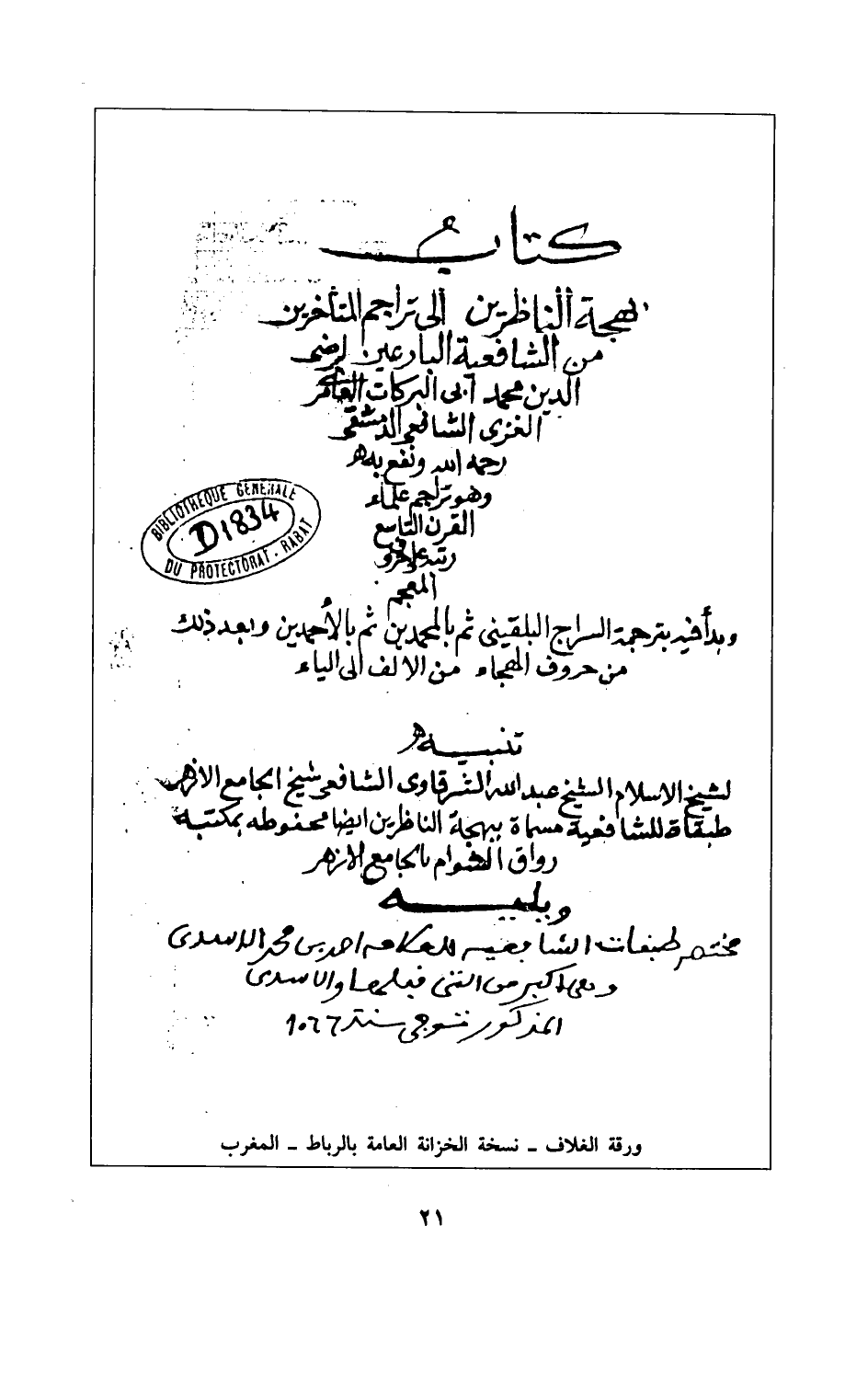 ورقة الغلاف - نسخة الخزانة العامة بالرباط - المغرب