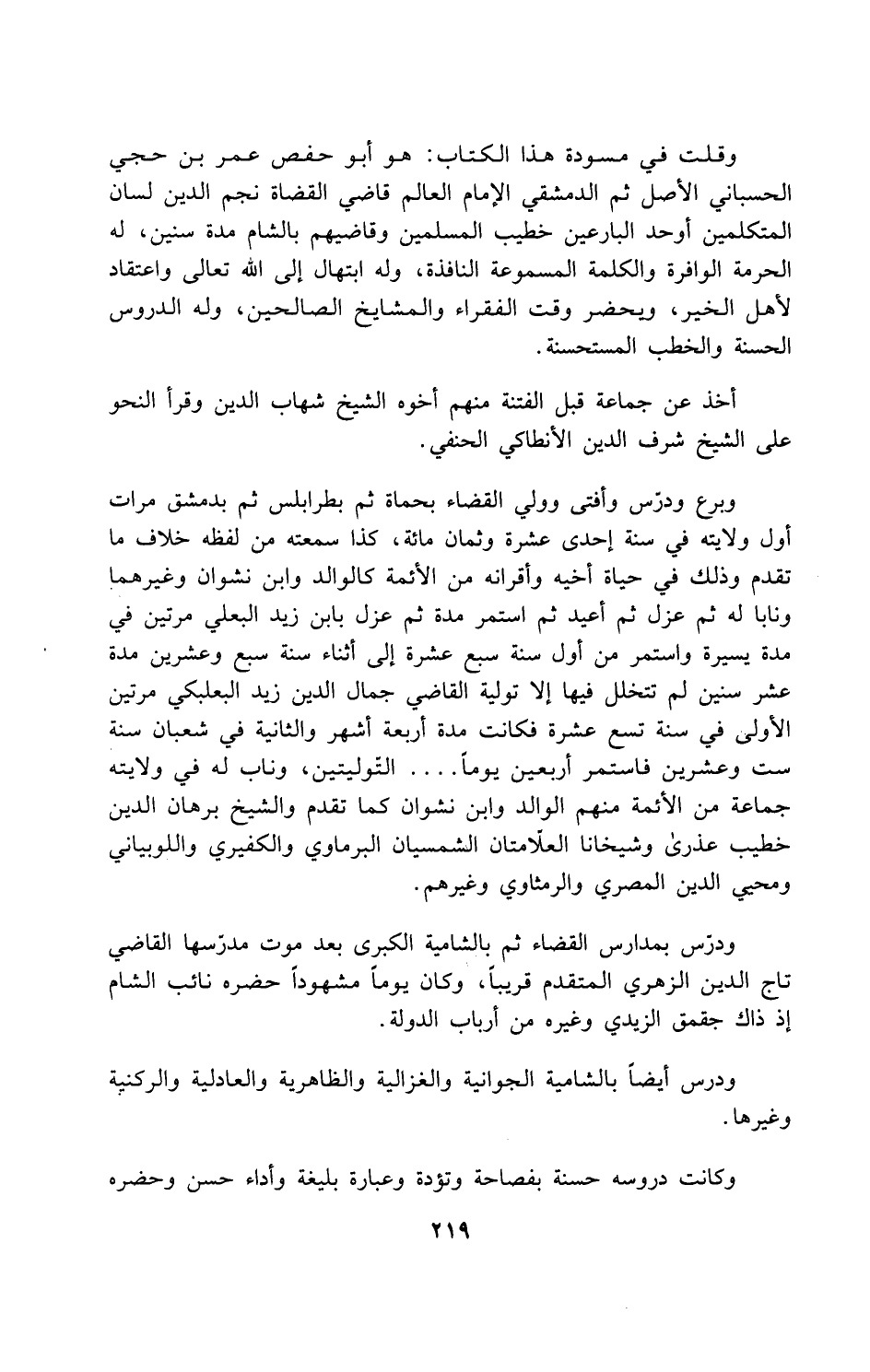 وقلت في مسودة هذا الكتاب: هو أبو حفص عمر بن حجي الحسباني الأصل ثم الدمشقي الإِمام العالم قاضي القضاة نجم الدين لسان المتكلمين أوحد البارعين خطيب المسلمين وقاضيهم بالشام مدة سنين، له الحرمة الوافرة والكلمة المسموعة النافذة، وله ابتهال إلى الله تعالى واعتقاد لأهل الخير، ويحضر وقت الفقراء والمشايخ الصالحين، وله الدروس الحسنة والخطب المستحسنة.