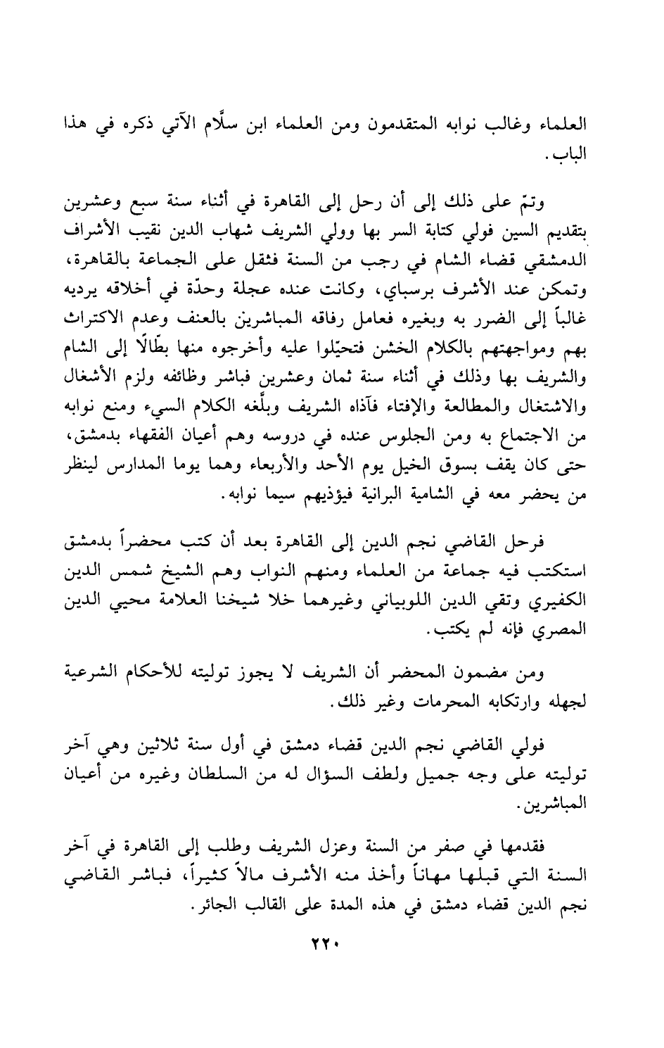 فقدمها في صفر من السنة وعزل الشريف وطلب إلى القاهرة في آخر السنة التي قبلها مهاناً وأخذ منه الأشرف مالًا كثيراً، فباشر القاضي نجم الدين قضاء دمشق في هذه المدة على القالب الجائر.