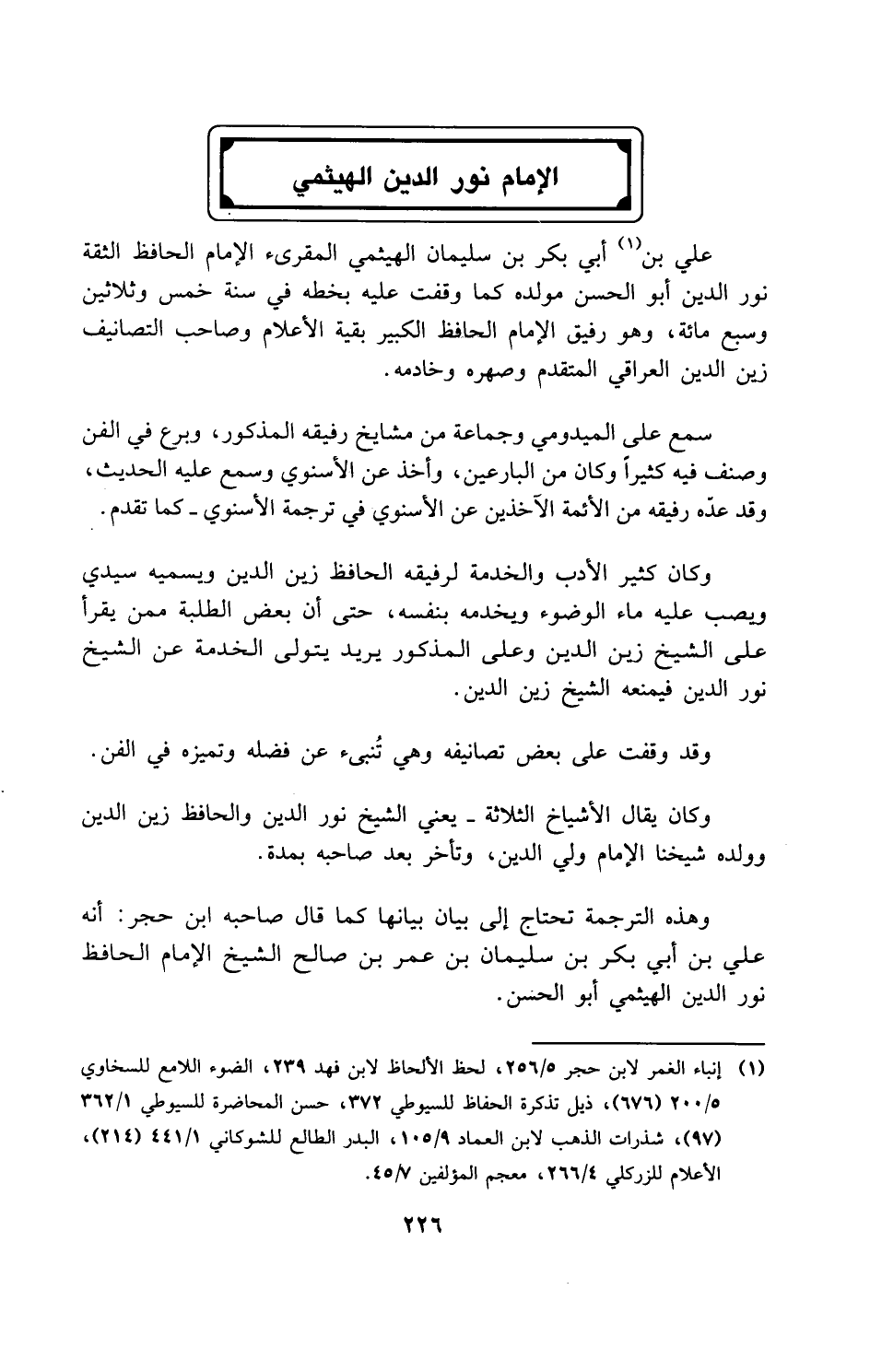 وهذه الترجمة تحتاج إلى بيان بيانها كما قال صاحبه ابن حجر: أنه علي بن أبي بكر بن سليمان بن عمر بن صالح الشيخ الإمام الحافظ نور الدين الهيثمي أبو الحسن.