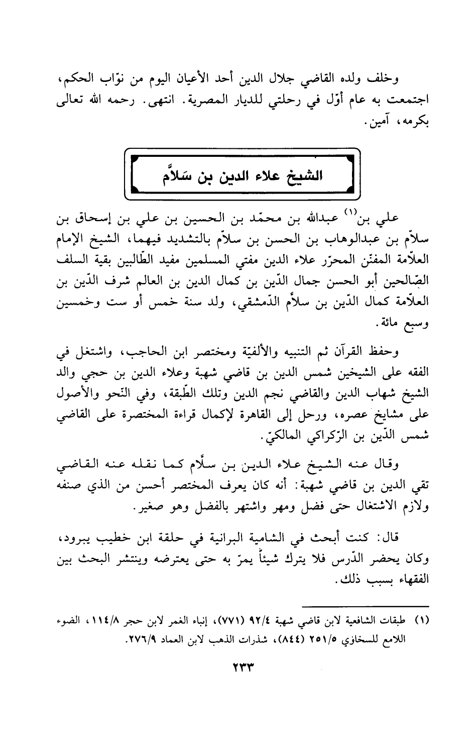 علي بن (¬1) عبد الله بن عقد بن الحسين بن علي بن إسحاق بن سلاّم بن عبد الوهاب بن الحسن بن سلاّم بالتشديد فيهما، الشيخ الإمام العلاّمة المفنّن المحرّر علاء الدين مفتي المسلمين مفيد الطالبين بقية السلف الصّالحين أبو الحسن جمال الدّين بن كمال الدين بن العالم شرف الدّين بن العلاّمة كمال الدّين بن سلاَّم الدّمشقي، ولد سنة خمس أو ست وخمسين وسبع مائة.