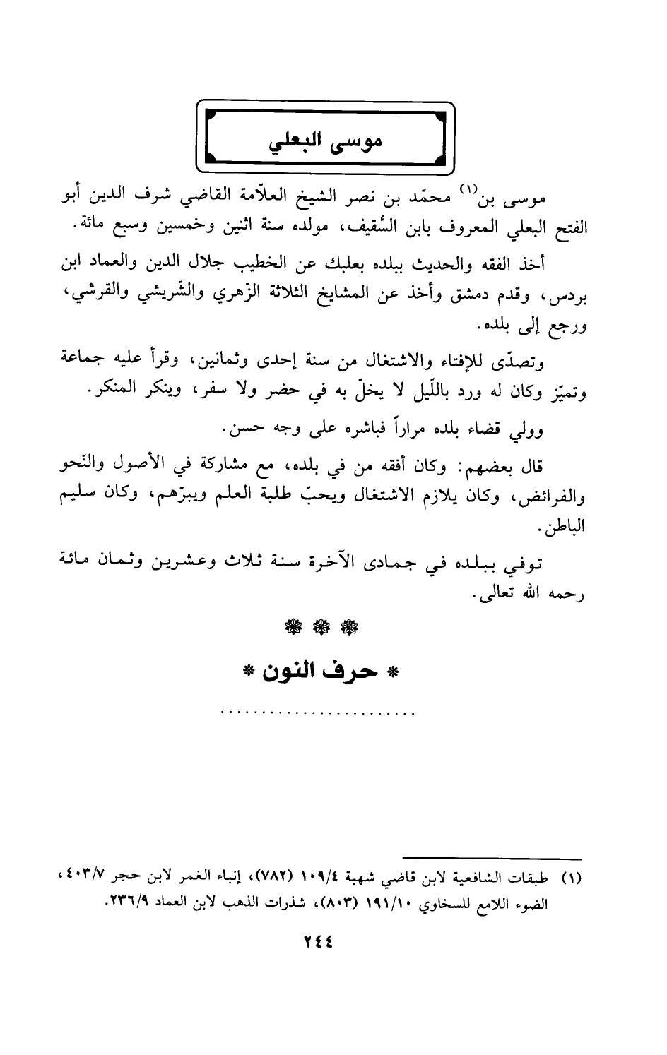 موسى بن (¬1) عقد بن نصر الشيخ العلاّمة القاضي شرف الدين أبو الفتح البعلي المعروف بابن السُّقيف، مولده سنة اثنين وخمسين وسبع مائة.