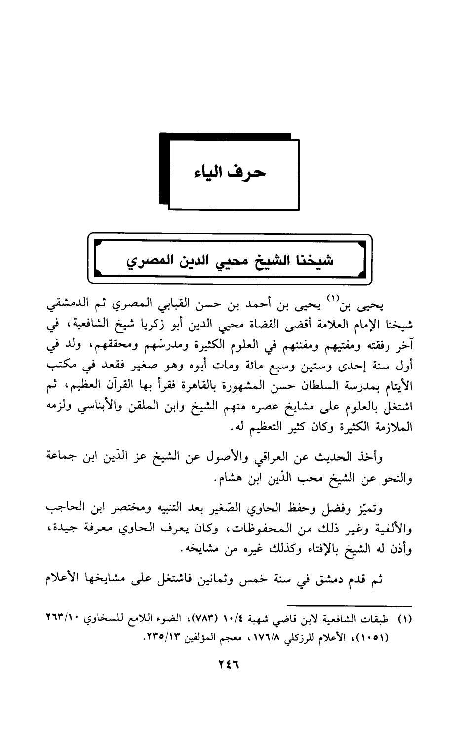 يحيى بن (¬1) يحيى بن أحمد بن حسن القبابي المصري ثم الدمشقي شيخنا الإمام العلامة أقضى القضاة محيي الدين أبو زكريا شيخ الشافعية، في آخر رفقته ومفتيهم ومفننهم في العلوم الكثيرة ومدرسّهم ومحققهم، ولد في أول سنة إحدى وستين وسبع مائة ومات أبوه وهو صغير فقعد في مكتب الأيتام بمدرسة السلطان حسن المشهورة بالقاهرة فقرأ بها القرآن العظيم، ثم اشتغل بالعلوم على مشايخ عصره منهم الشيخ وابن الملقن والأبناسي ولزمه الملازمة الكثيرة وكان كثير التعظيم له.